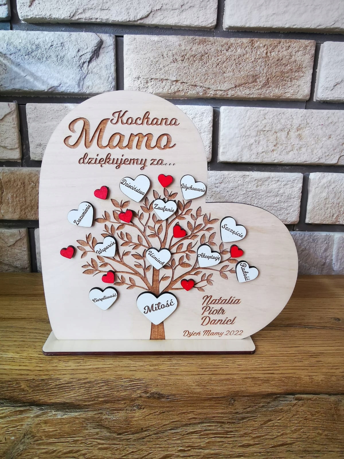 Деревянное сердце с спасибо маме с подписью.