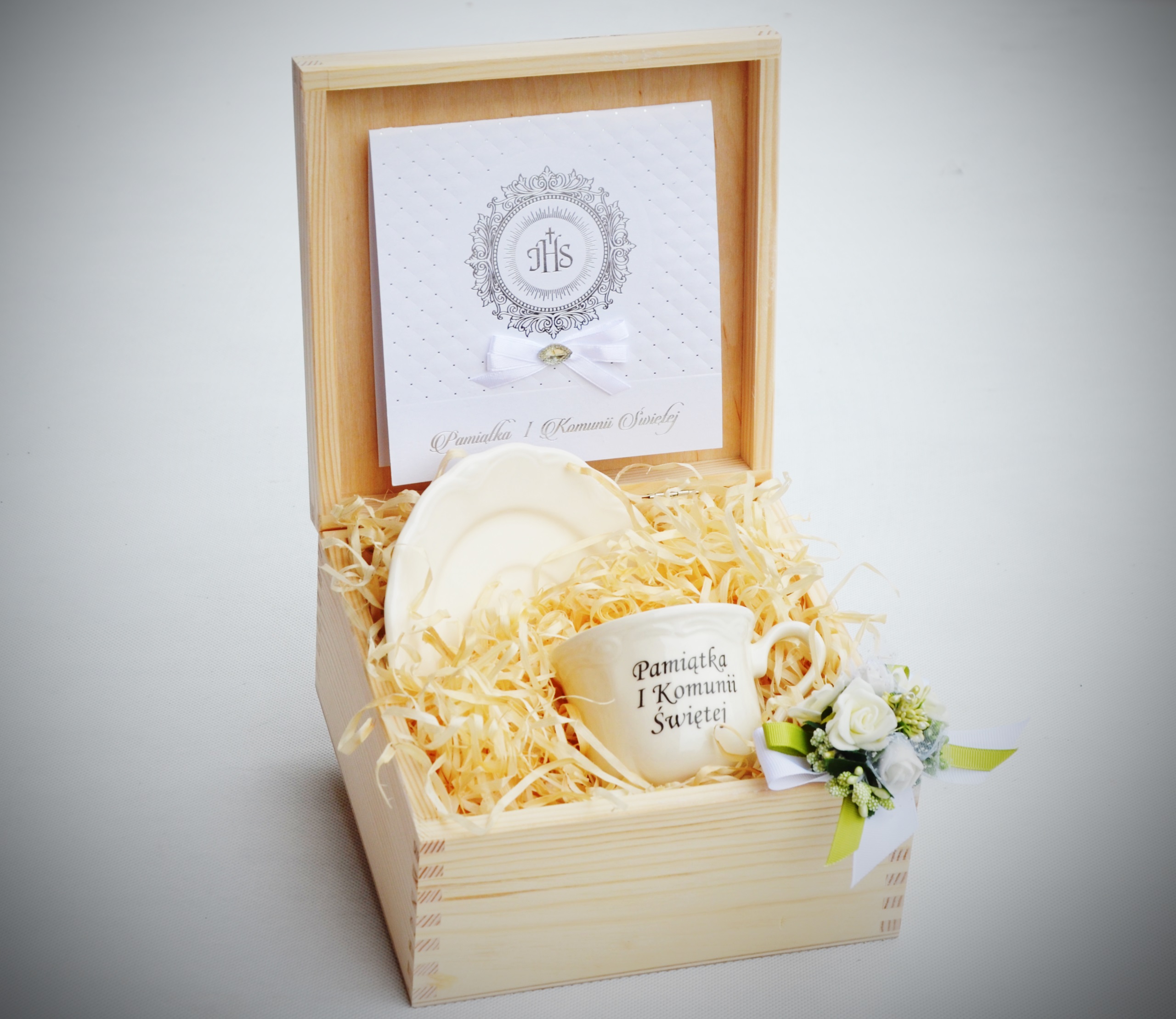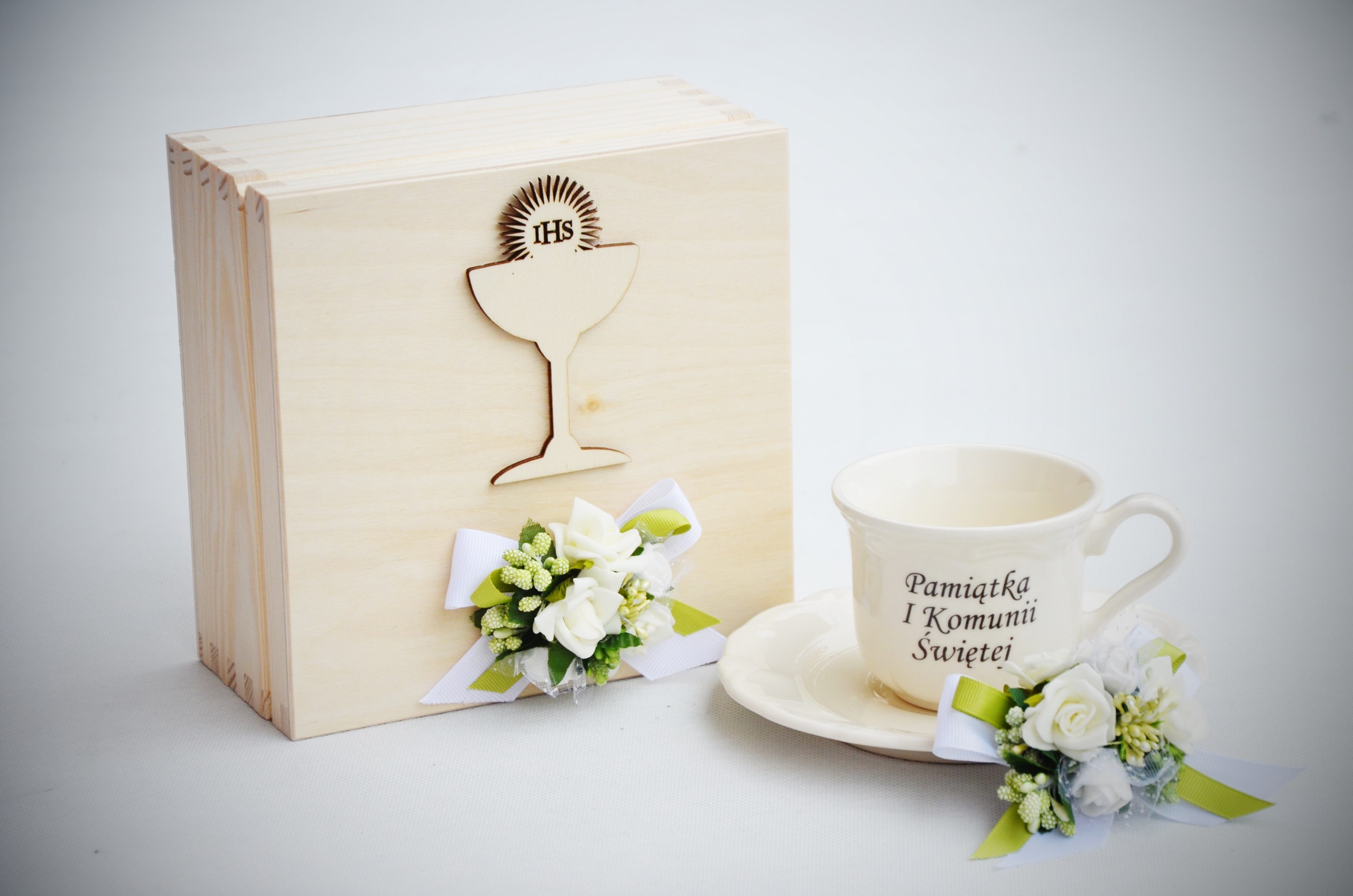 Нежный бело-зеленый комплект с белым сувениром к Первому причастию. Подходит как мальчикам, так и девочкам. Украшение из качественной цветочной фурнитуры.