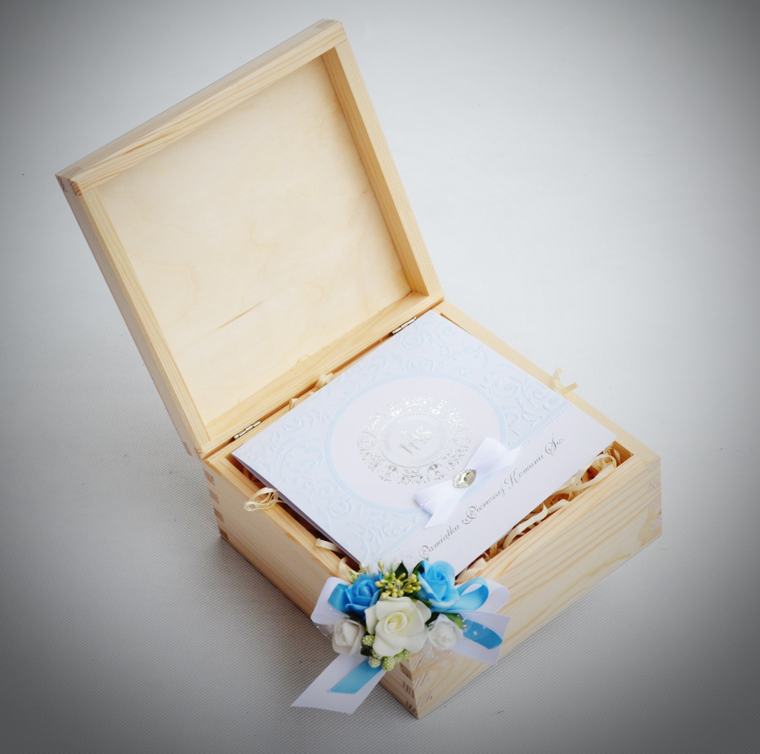 Оформление в нежных синих тонах с белой и зеленой фурнитурой. В комплект входит синий сувенир Первого Причастия, дополняющий красивый внешний вид шкатулки, которую можно использовать как место для Библии, священной книги или четок.