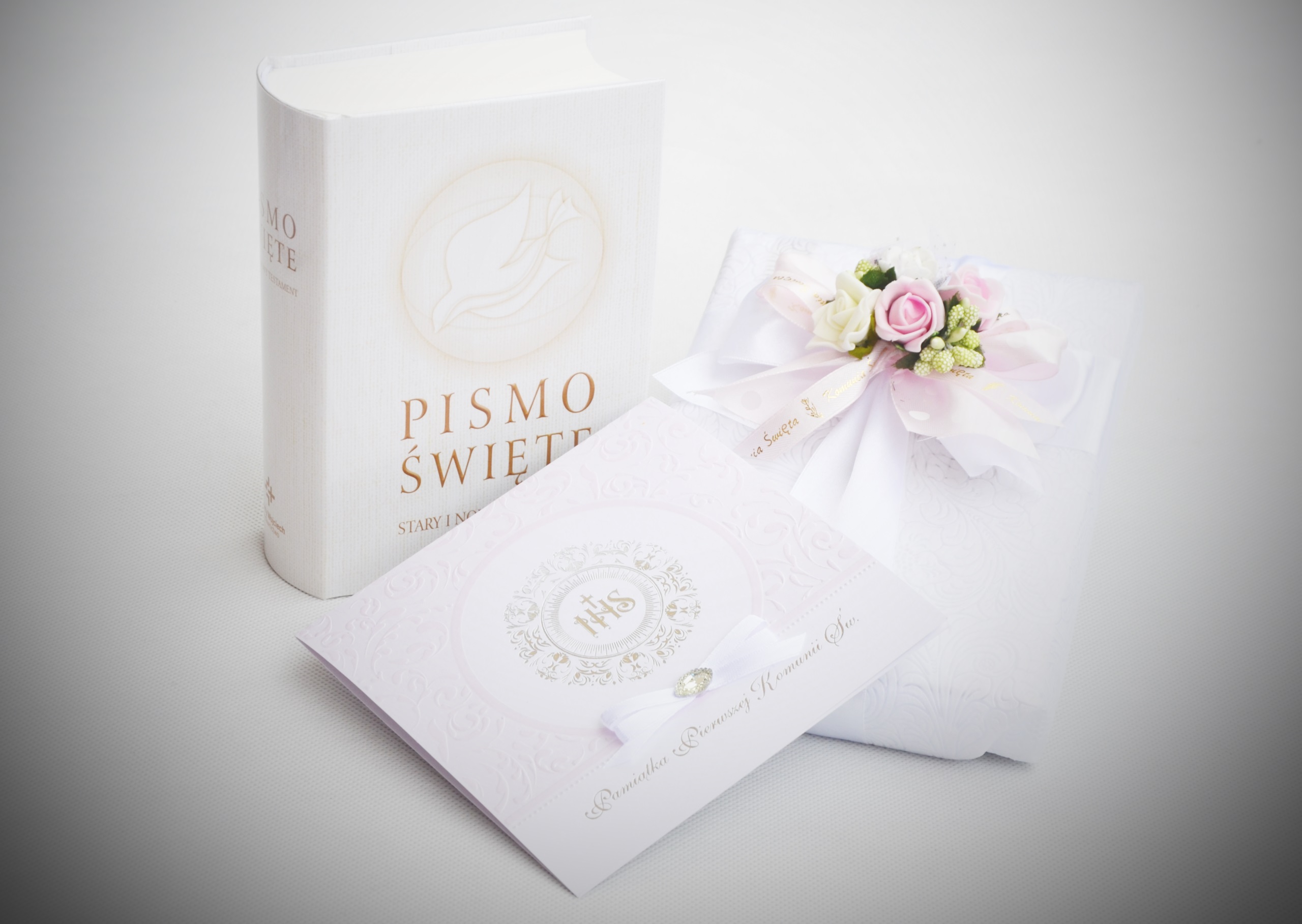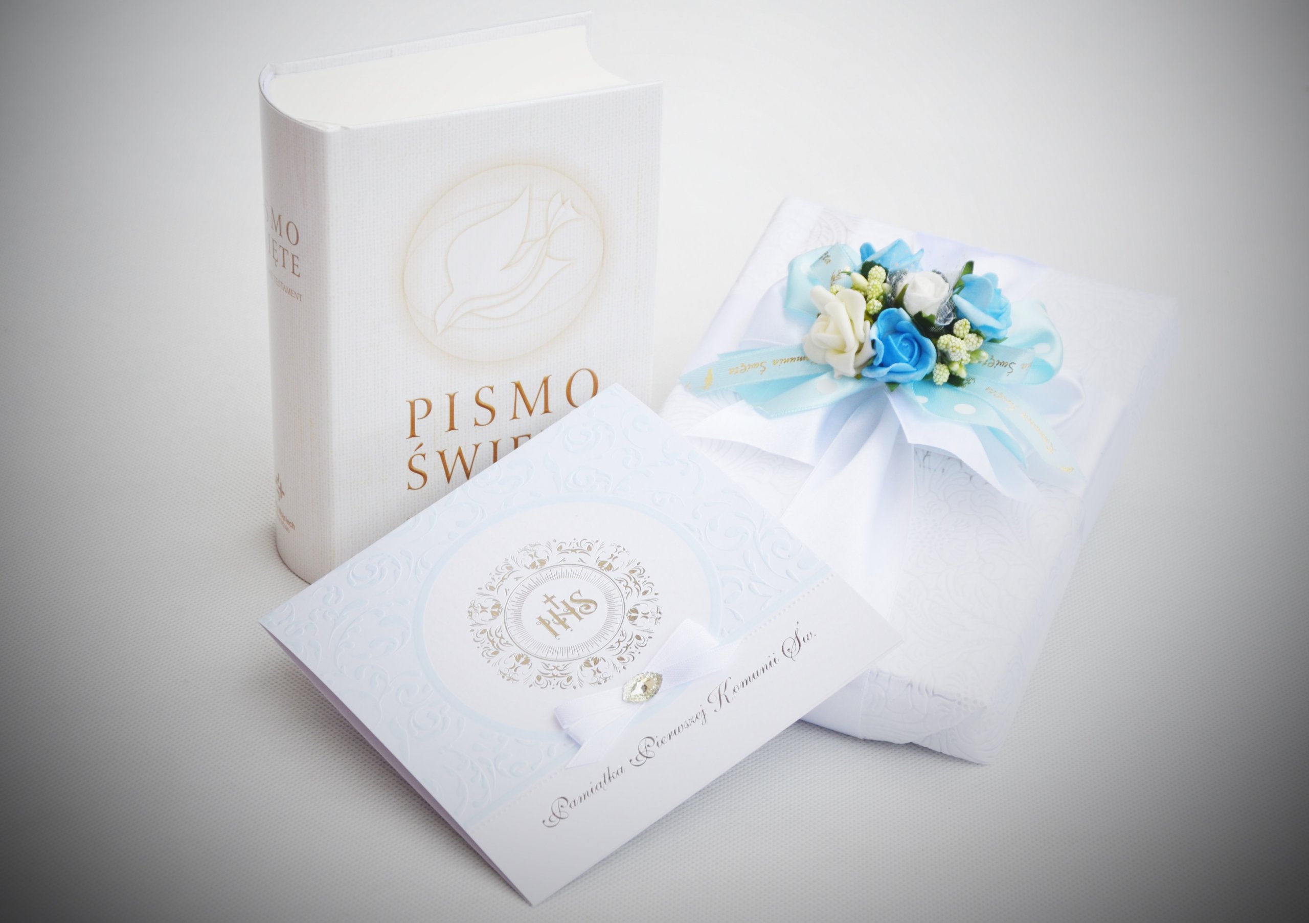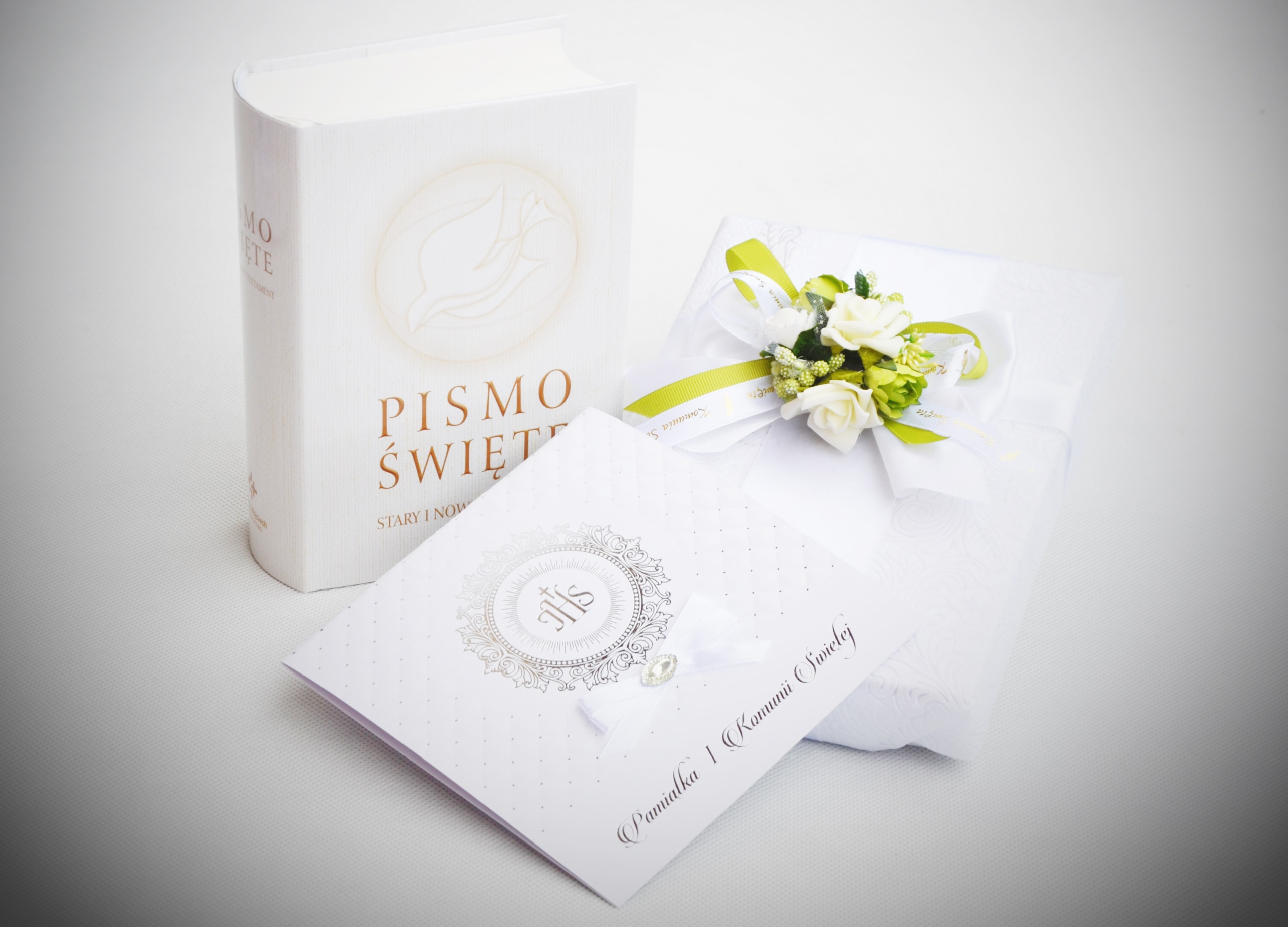 Приглашаем Вас приобрести набор, в который входят: БиблияВетхий и Новый Завет, красиво упакованная в эксклюзивный материал и украшенная качественное цветочное оформление в одном из трех цветовых вариантов (зеленый, синий, розовый). В набор входит эксклюзивный рельефный сувенир «Первое причастие» с позолоченными пожеланиямив трех цветовых вариантах: белом, розовом, синем.