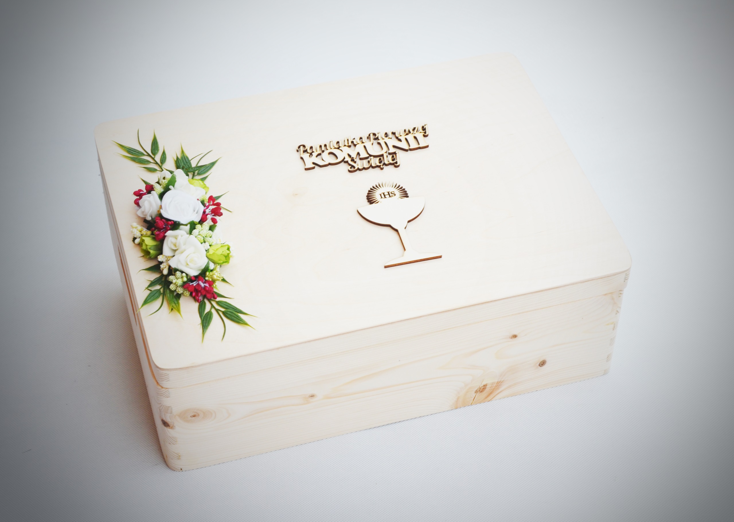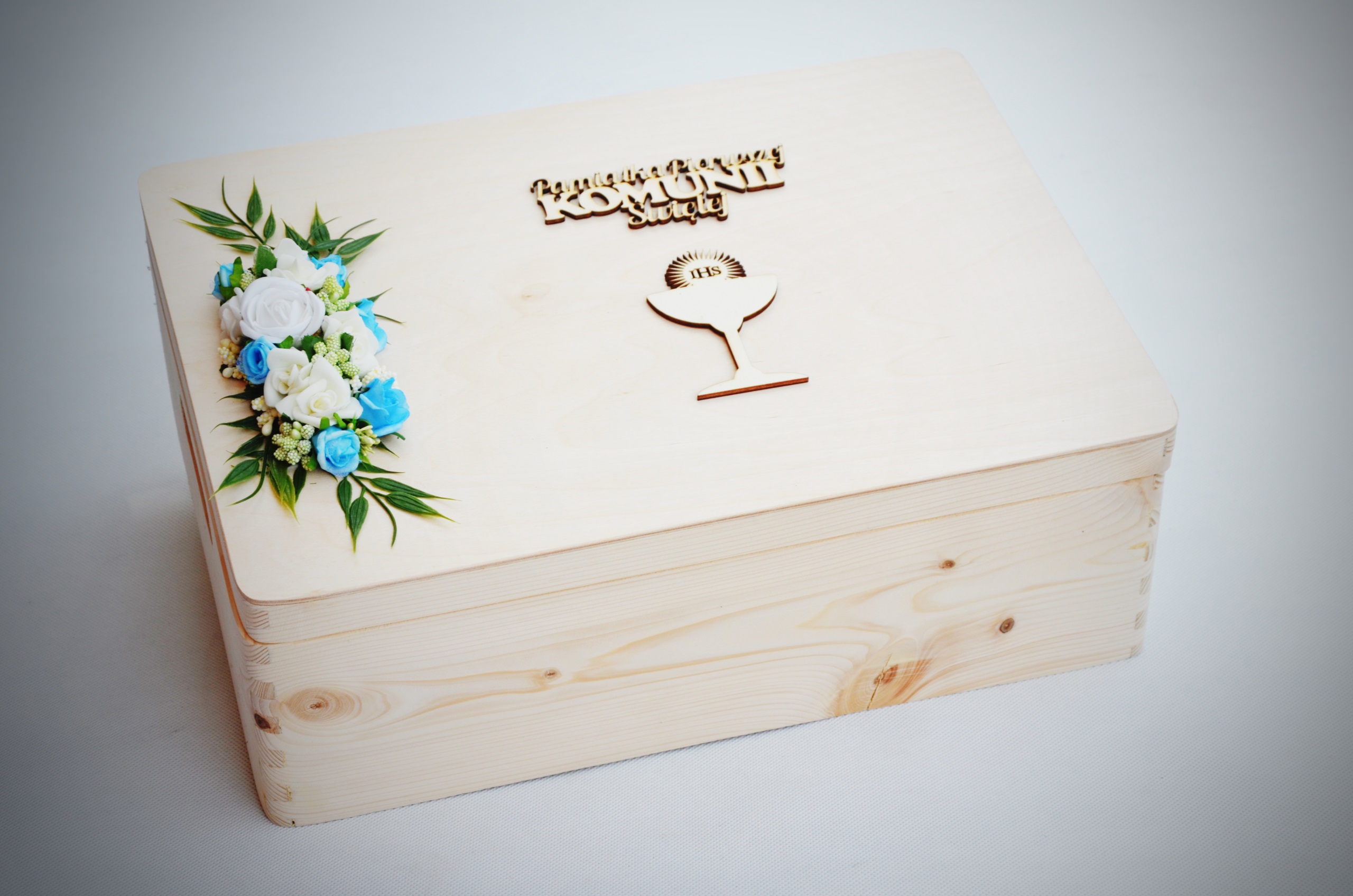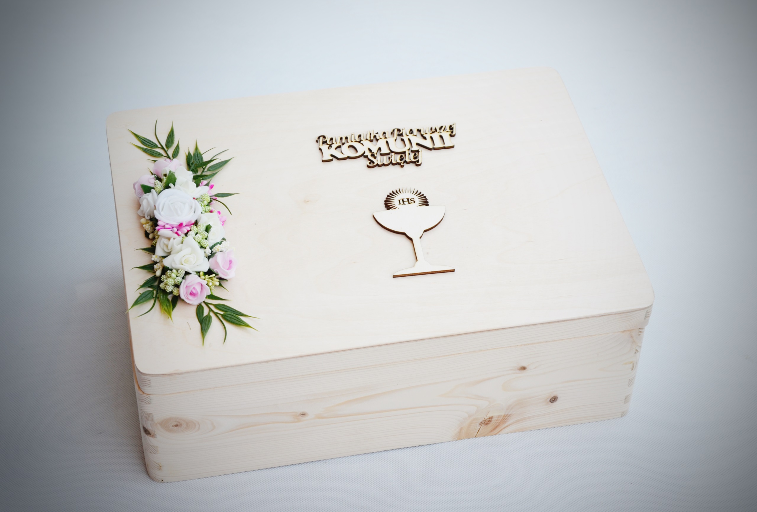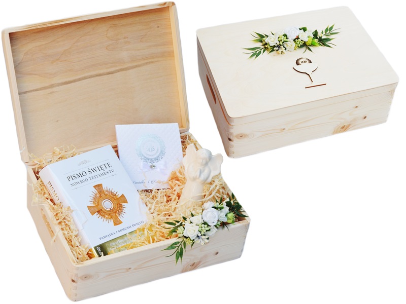 Большой, красиво сделанный, прочный деревянный сундук, размер 30х40х14 см. Он послужит местом для хранения сувениров к Первому Причастию, Библии, четок и т. д.