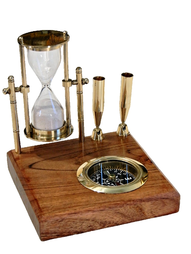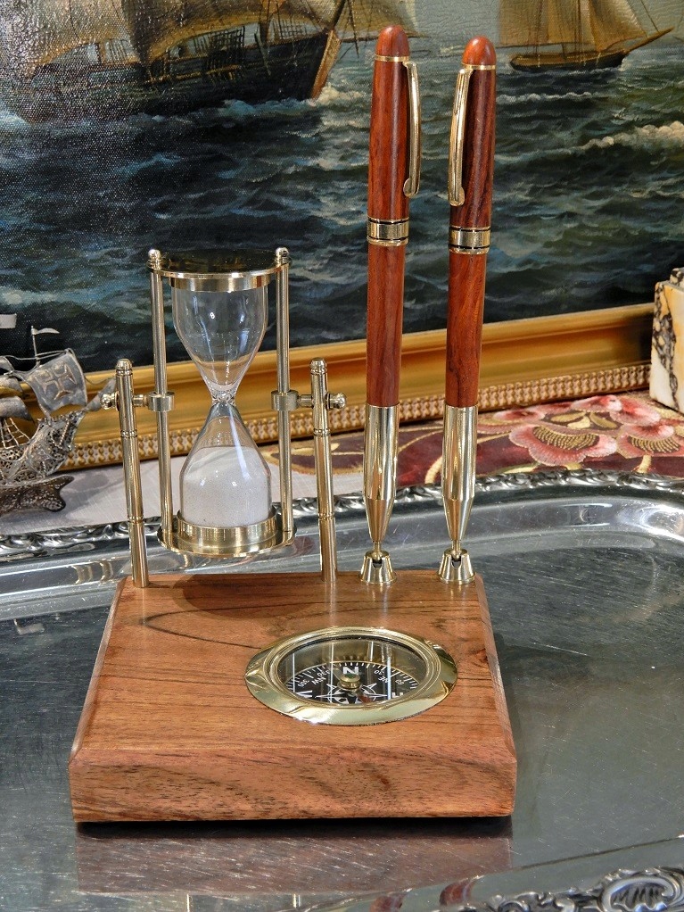 Красивый настольный набор - латунный глобус, компас, вкладыши для 2-х ручек на деревянной основе.