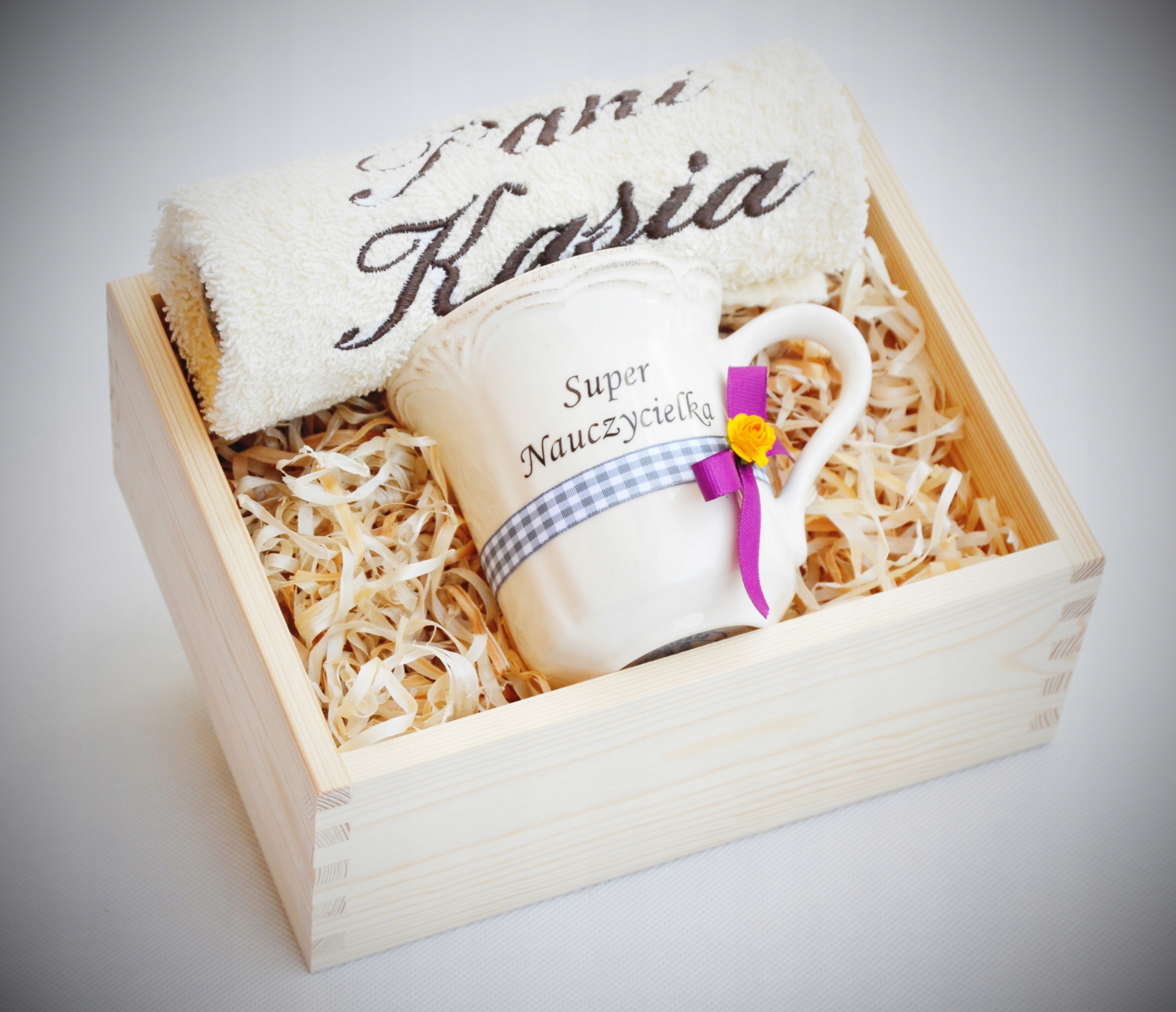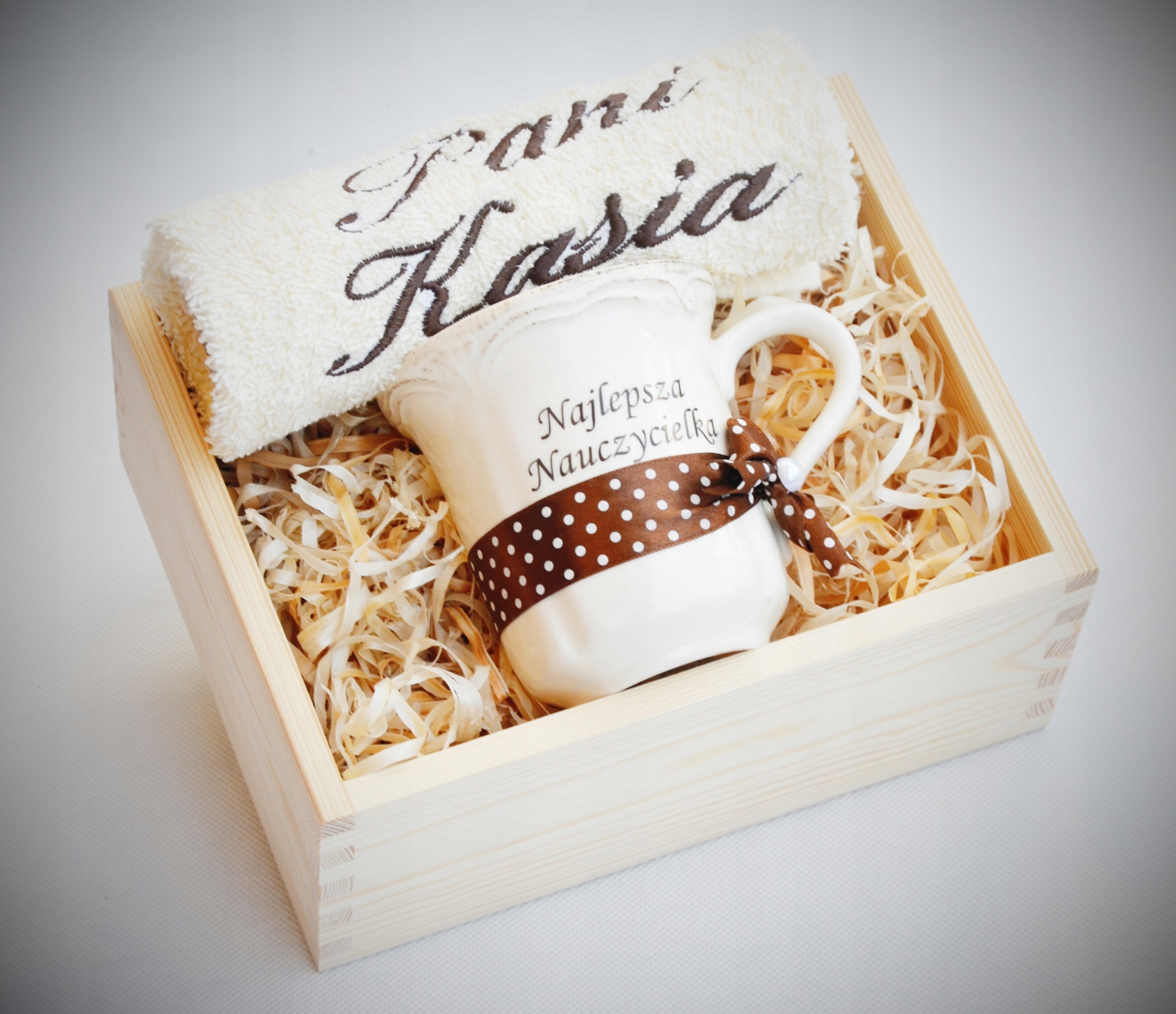 Элегантный, оригинальный и практичный подарок любимому учителю. Эксклюзивный набор — фарфоровая кружка и полотенце с вышивкой — все в деревянной коробке.