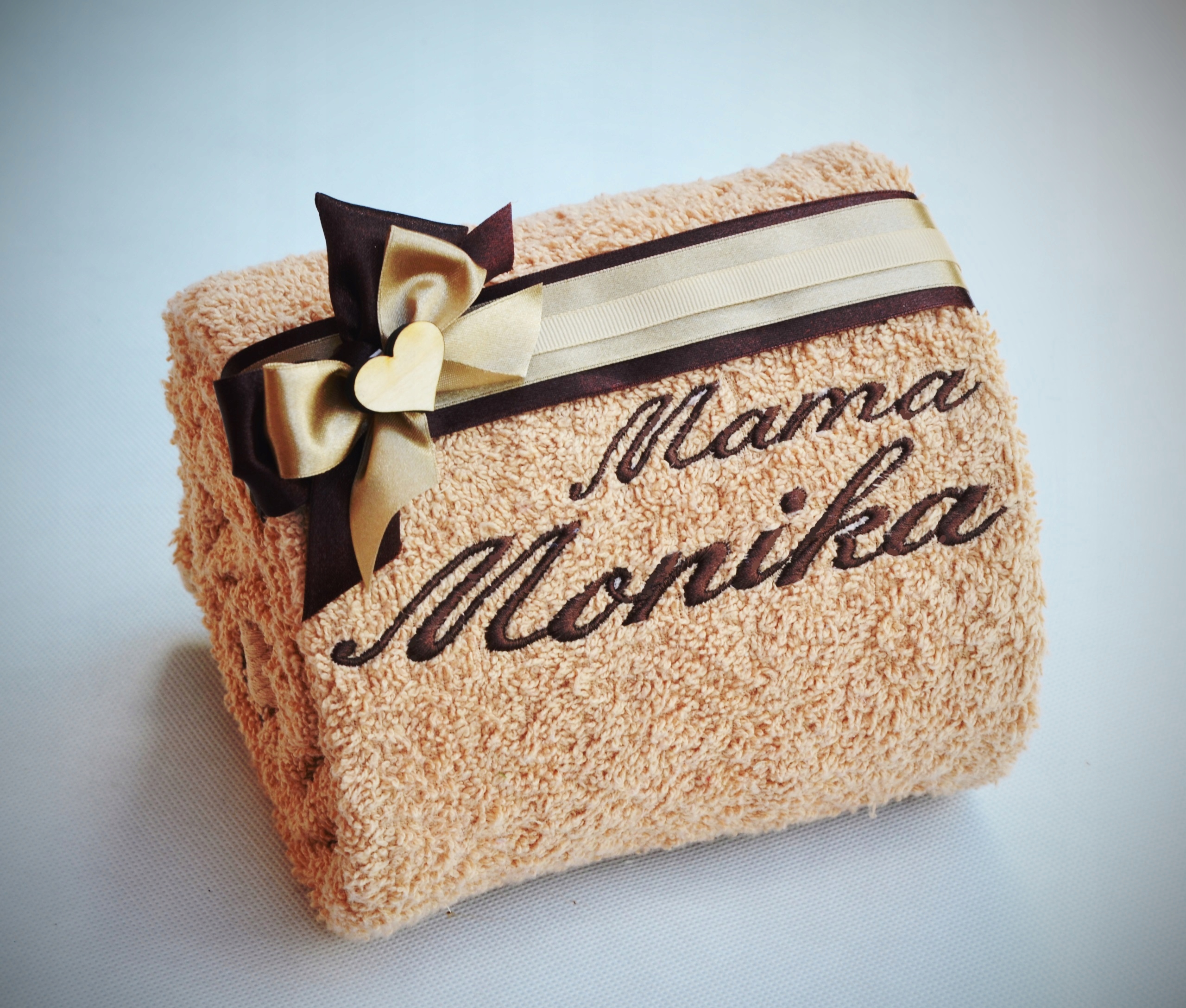 - Плотное и пушистое банное полотенце 50х100 см, цвет кофе (светло-коричневый) с темно-коричневой вышивкой «Мама+имя»,вес 500г/м2,