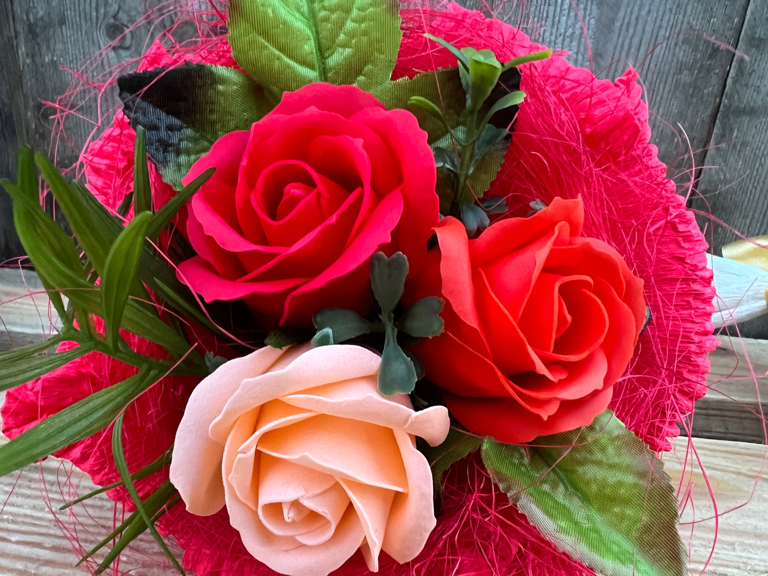❤️ красивые, ароматные, крупные мыльные цветы в оттенки красного и оранжевого цвета в окружении декоративных аксессуаров из сизаля и искусственного зеленого цвета, общая высота и диаметр примерно 18 - 20 см,