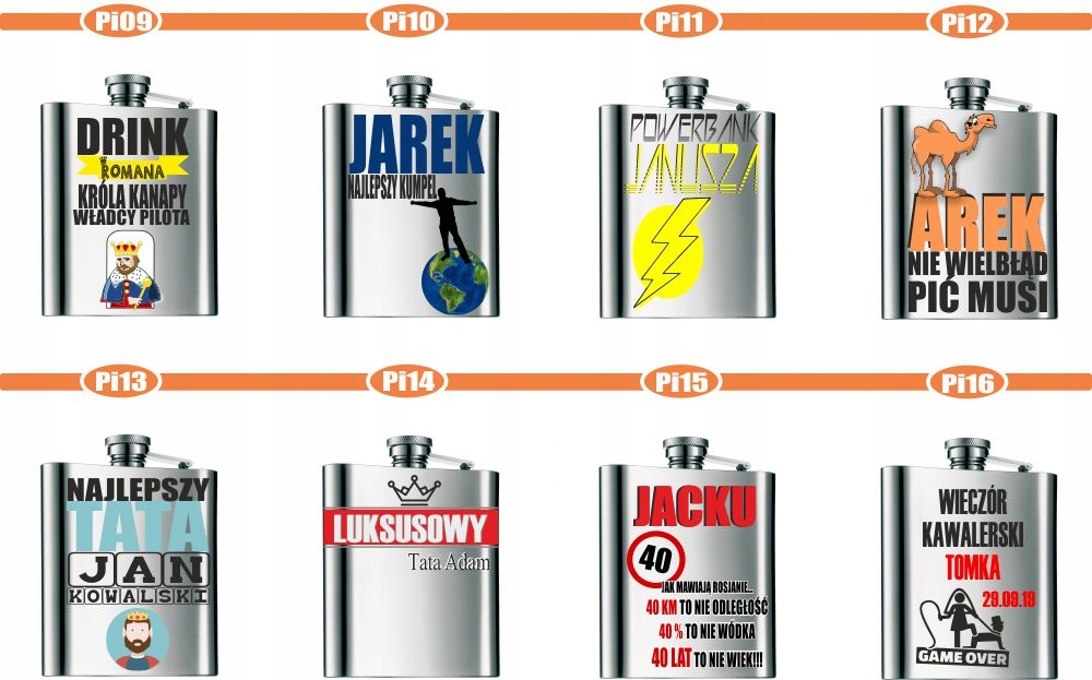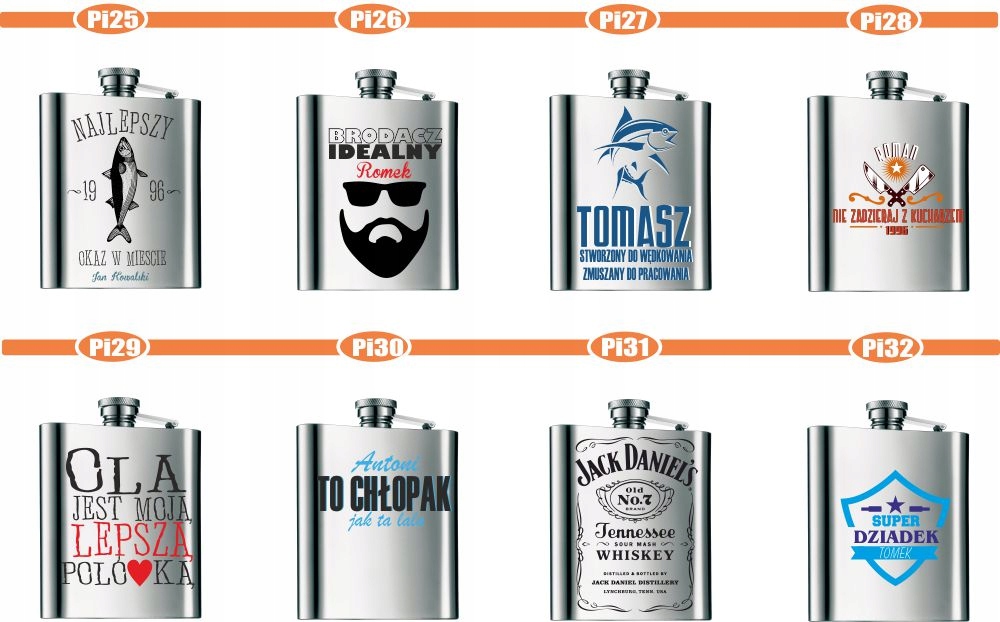 После покупки пришлите номер шаблона, который будет размещен на фляжке, и данные для ввода, например, имена или название мероприятия. Если информации о шаблоне нет, делаем случайный выбор.
