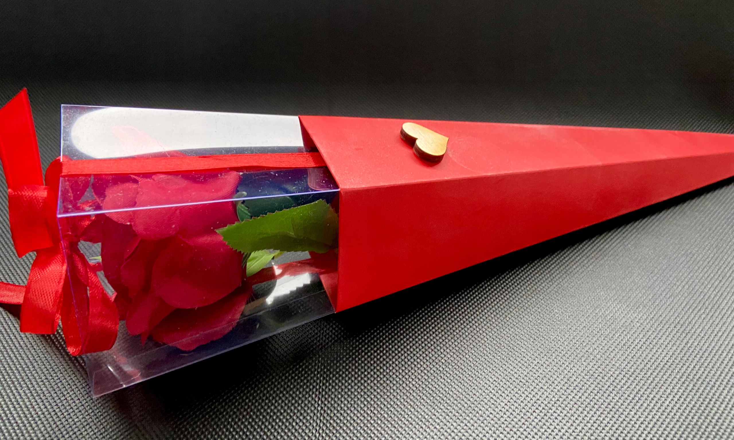 - красная, искусственная, ароматная роза в конусе, длина 40 см.