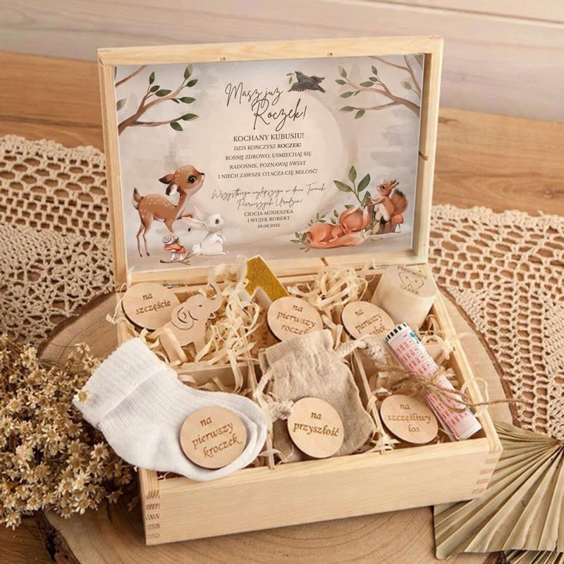 Подарок на день рождения ребенка в деревянной коробке с персонализацией, выполненной в природном, экологическом стиле. В подарок включены элементы, отмечающие первые моменты жизни ребенка, а также гравированные кружочки с надписями. Все дело украшено открыткой с красивым текстом поздравления к первому дню рождения и очаровательной графикой лесных животных. Это красивая идея подарка на день рождения ребенка, который могут подарить крестные или бабушка и дедушка.