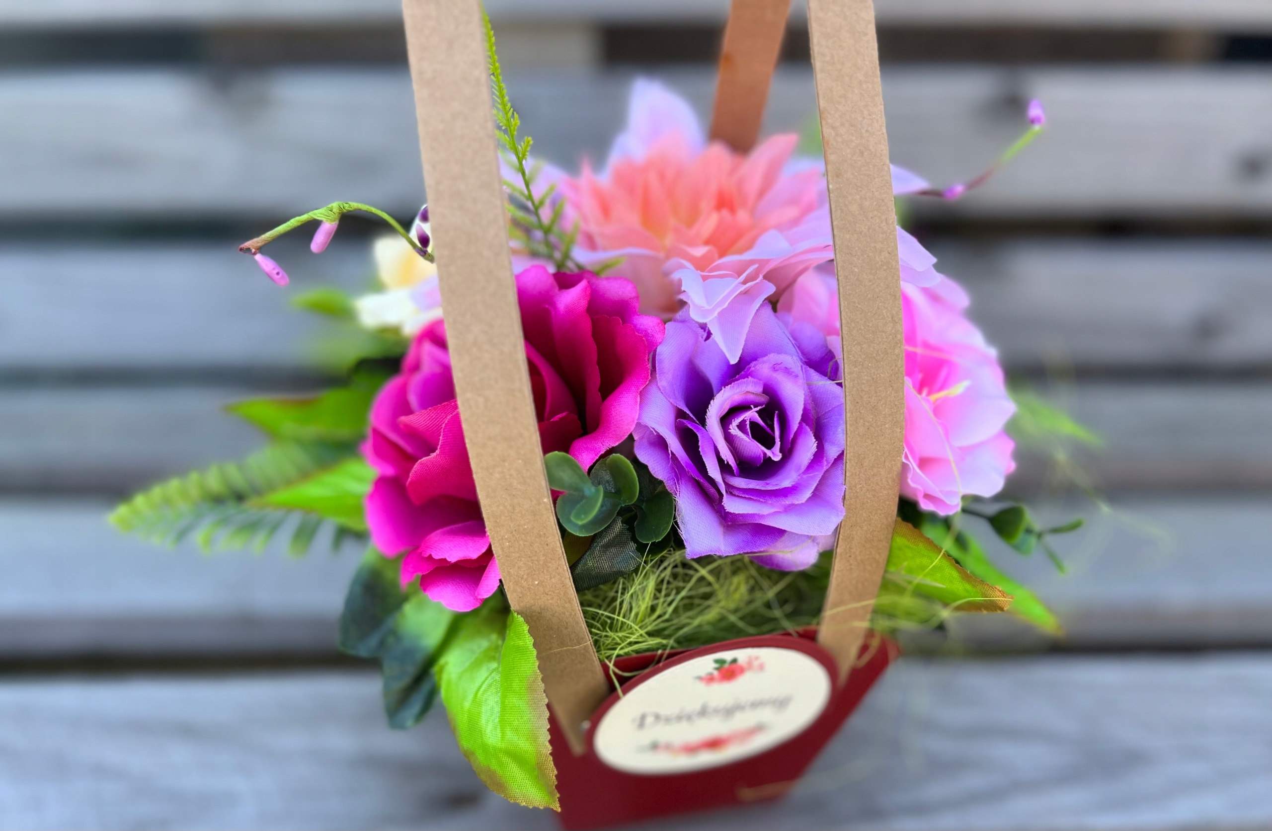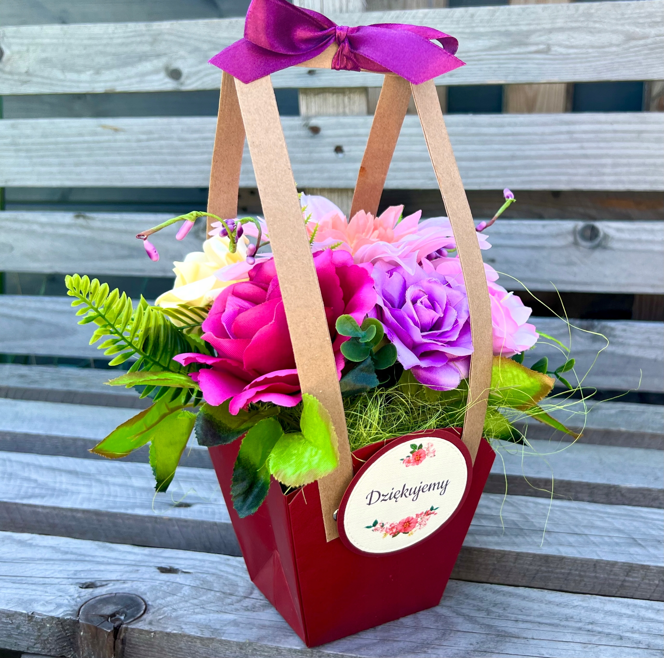 - впечатляющее украшениеиз искусственных цветов и зеленых аксессуаров, которые прекрасно имитируйте настоящие цветы – такой подарок будет радовать глаз гораздо дольше, чем букет живых цветов,