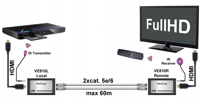 Локальная часть подключается кабелем HDMI к источнику сигнала (проигрыватель Blu-Ray, компьютер, SAT-тюнер, HD-камера и т. д.), а удаленная часть подключается кабелем HDMI к приемнику сигнала (телевизору). , монитор, проектор и т. д.). Подключите блок питания к локальной части (удаленная часть не требует питания – она питается от локальной части по витой паре). Подключаем передатчик и приемник сигнала телеуправления к локальной и удаленной части (в зависимости от места, с которого мы хотим управлять оборудованием, приемник телеуправления устанавливаем в локальной или удаленной части). Обе части (локальную и удаленную) соединяем с помощью двух витых пар категории 5e/6/7 с разъемами RJ45. Чаще всего предлагаемый удлинительный кабель используется для подключения проигрывателя DVD/BluRay к телевизору/монитору и управления проигрывателем с экрана.