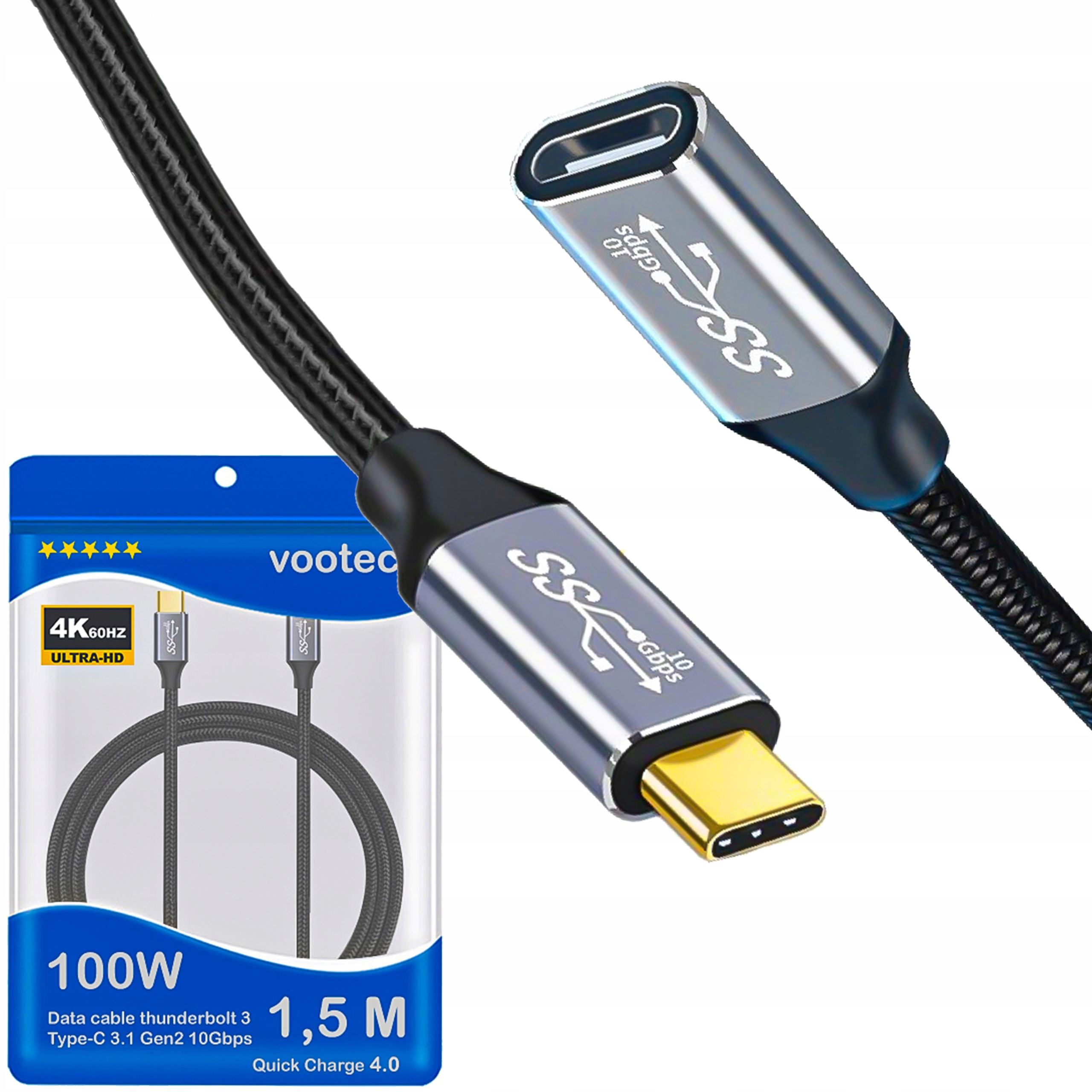 Высококачественный удлинитель vootec USB-C 3.1 Gen2 Thunderbolt 3 используется для быстрой зарядки 100 Вт, 5 А, передачи данных со скоростью до 10 ГБ/с и передача сигнала АУДИО/ВИДЕО в высоком качестве 4K 60 Гц.
