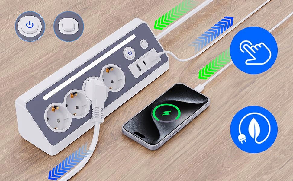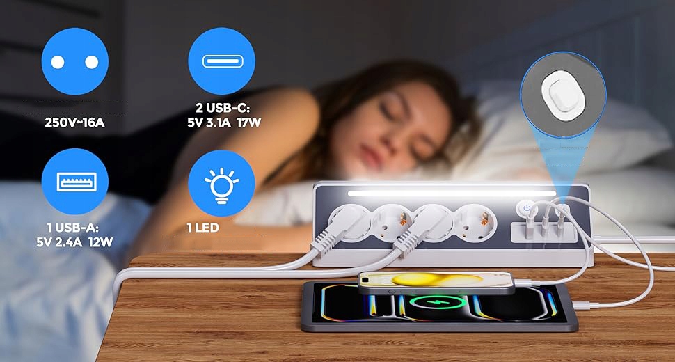 2. Сетевая вилка: многофункциональная розетка с 4 евророзетками (3680 Вт/16 А), 2 портами USB-C, 1 портом USB-A (общая выходная мощность 5 В/3,4 А) и 1 светодиодным ночником, 2 переключателями. В зависимости от ваших потребностей вы можете использовать эти многочисленные плагины в офисе, на кухне, в спальне, гостиной и т. д.