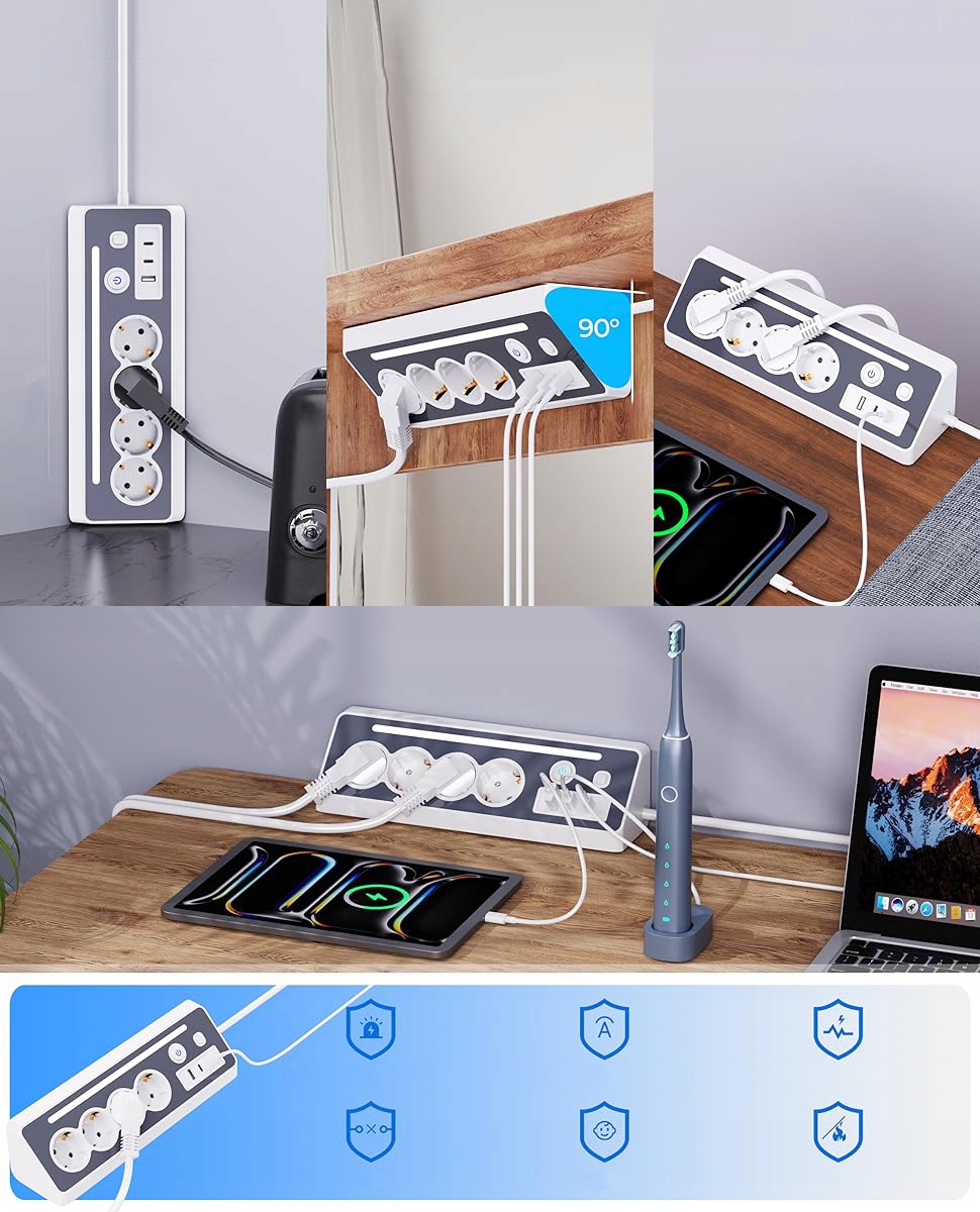 3. Треугольная угловая розетка 90°:Эта многофункциональная USB-розетка имеет треугольную конструкцию под углом 90°, что делает ее особенно подходящей для размещения в углах стен, столов, диванов и т. д. Это особенно полезно на кухнях, где пространство часто ограничено. Это особенно полезно на кухнях и в офисах, где пространство часто ограничено. Компактный дизайн можно легко интегрировать в различные помещения, не занимая слишком много места.