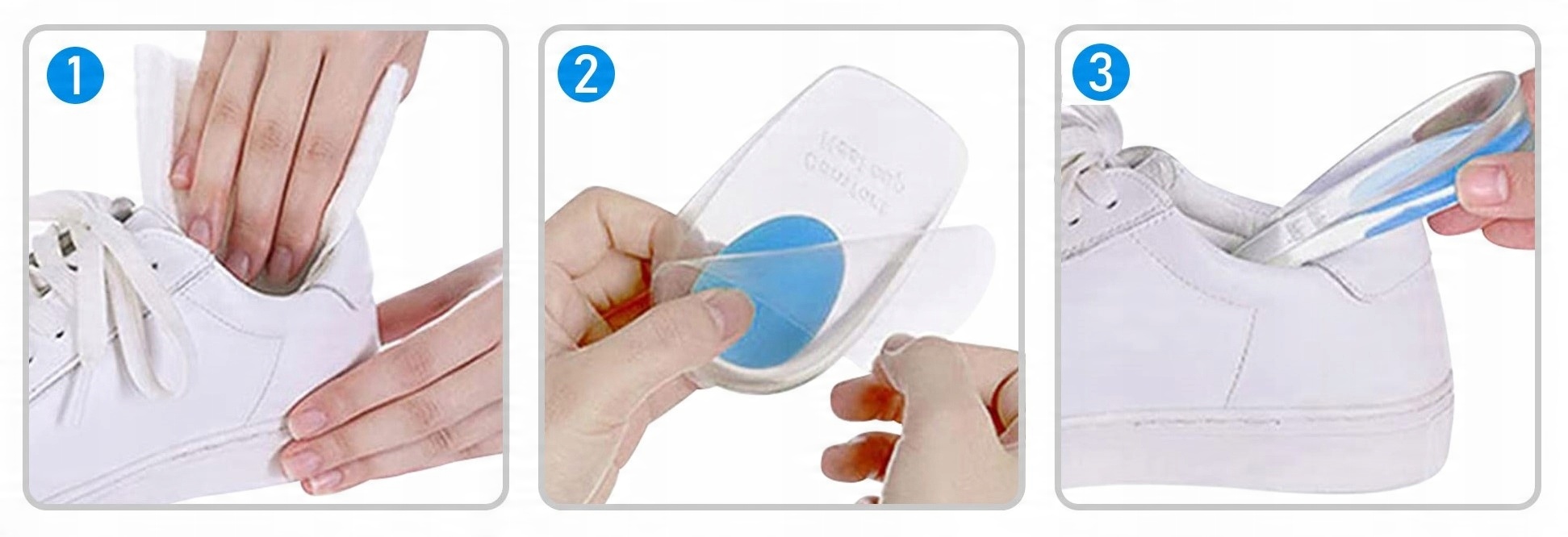 Гелевые пяточные носки приклеиваются к обуви после снятия защитной фольги. Благодаря этому они не двигаются при ходьбе или снятии обуви и обеспечивают максимальный комфорт использования.