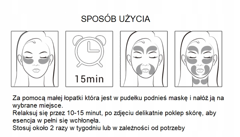 Для использования 2-3 раза в неделю. Средство следует нанести на кожу под глазами на 15 минут, а затем аккуратно нанести остатки средства на лицо. Подушечки также подходят для использования на других участках лица (например, на лбу) или шее и рту. Для охлаждающего эффекта упаковку можно хранить в холодильнике.