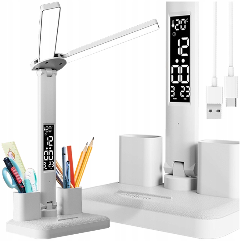 PODWÓJNA LAMPKA BIURKOWA LED Z WYŚWIETLACZEM ZEGAR ORGANIZER TEMP DATA 6w1