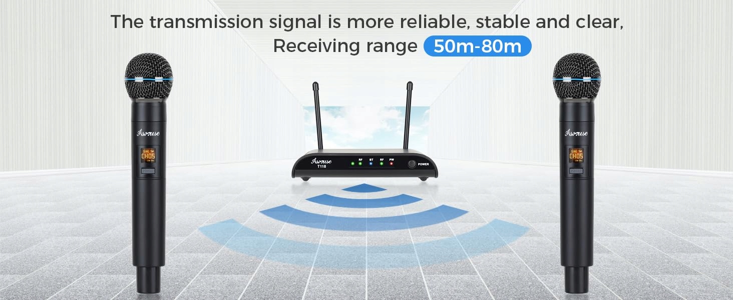Караоке-система с беспроводным микрофоном имеет радиус действия беспроводной связи УВЧ до 80 метров и обладает высокой устойчивостью к помехам.