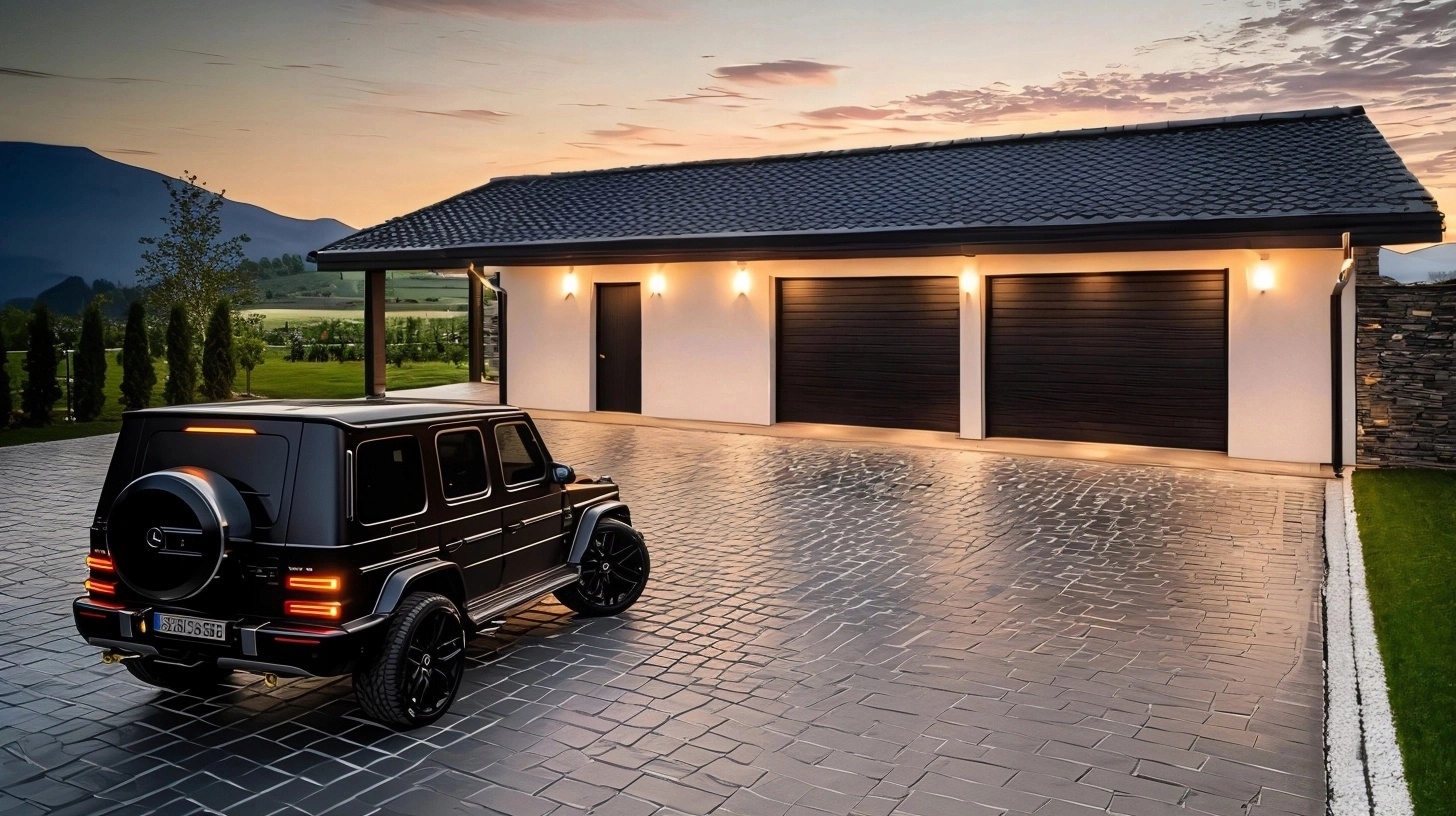 к зданию с левой стороны прилипает укрытие, покрытое расширением крыши главного гаража. С традиционными элементами видимой фермы на крыше гараж, безусловно, вписывается в каждый тип ландшафта и зданий.