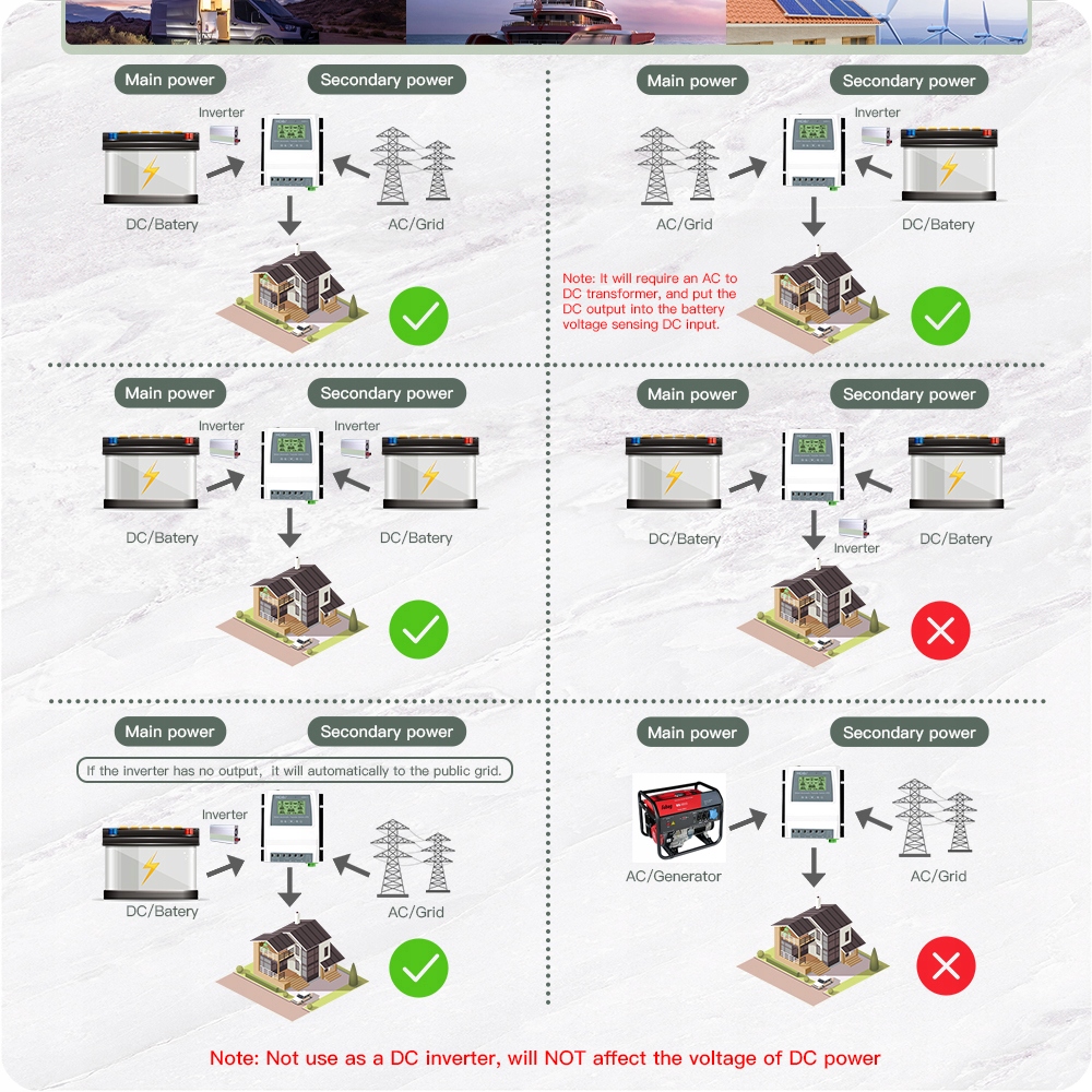- 【Выгодно для солнечной или ветровой системы с ручным переключением】 В пасмурную или солнечную погоду в безветренные дни, когда батарея разряжена, он автоматически переключается на питание от сети, чтобы защитить батарею, особенно когда напряжение батареи ниже точки отключения, он автоматически переключается обратно на питание от батареи, когда напряжение батареи выше, чем восстановление точки отключения, действует как ИБП обратного направления с обновленной функцией ручного переключения для вашего удобства.