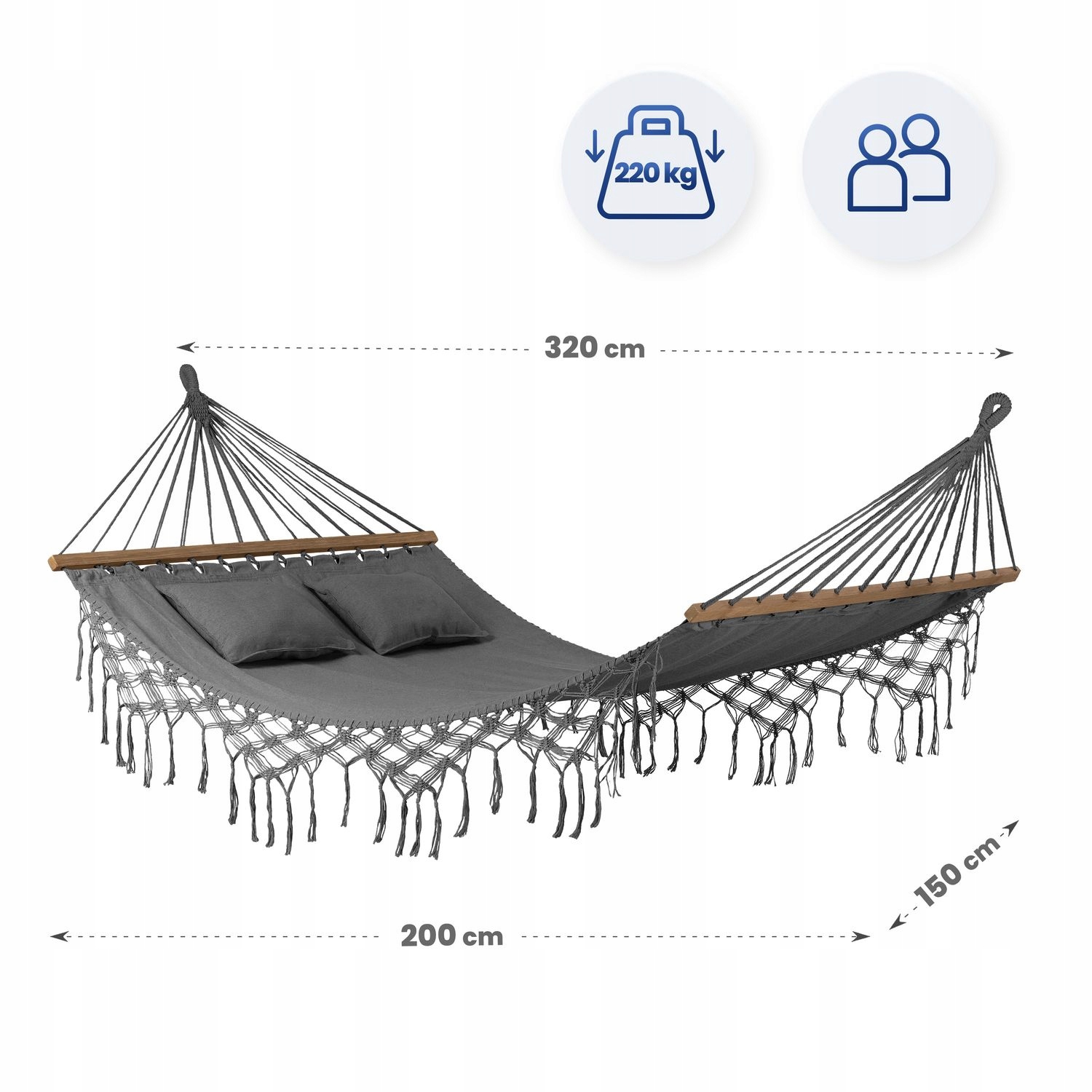 Гамак был разработан, чтобы обеспечить максимальный комфорт для двух человек. Его солидная конструкция обеспечивает безопасное использование при нагрузке до 220 кг, а прикрепленные подушки увеличивают удобство отдыха.