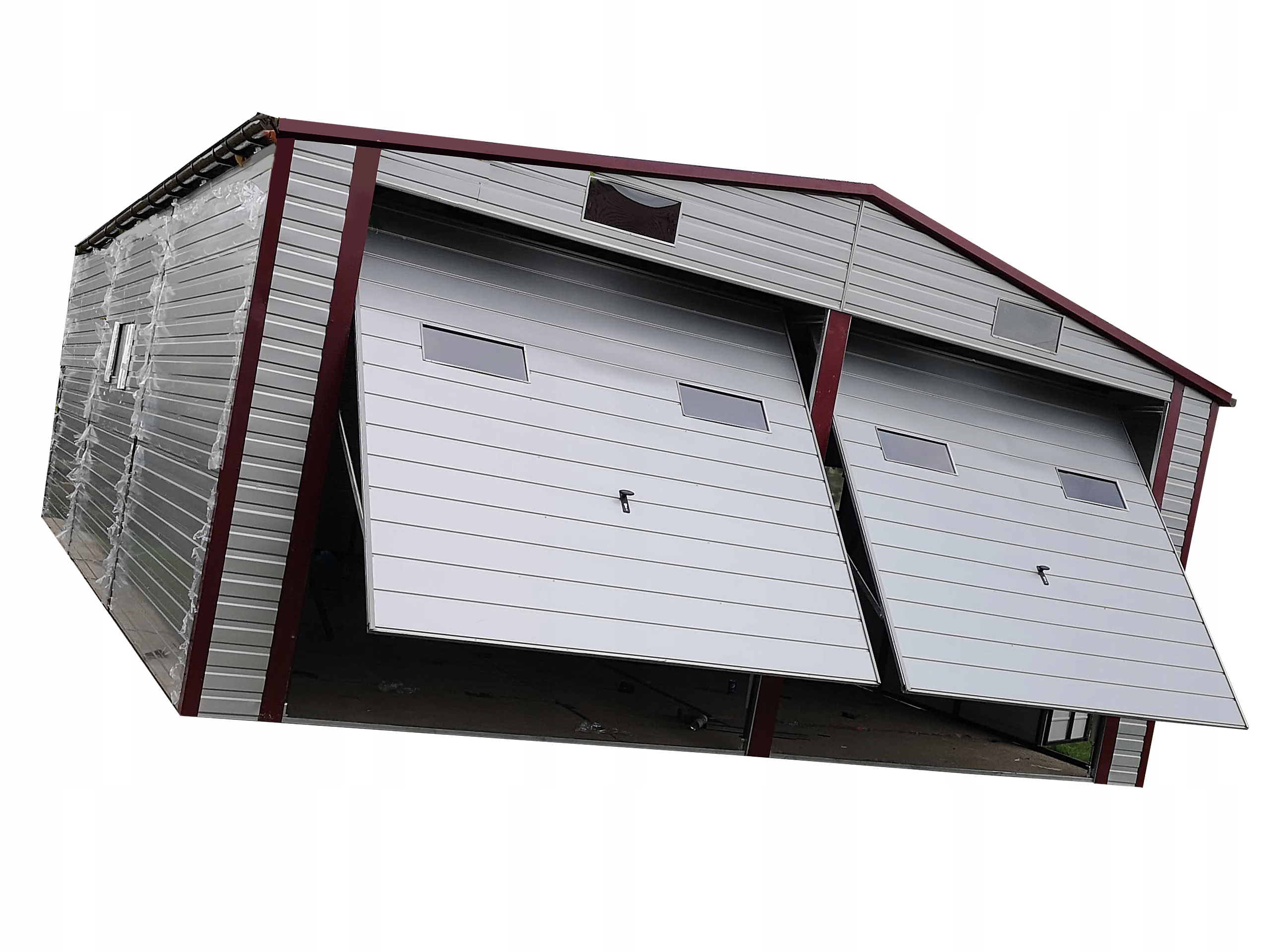Гараж В здании из листового металла установлены двое открывающихся вверх ворот, окрашенных в цвет гаража или из палитры RAL.