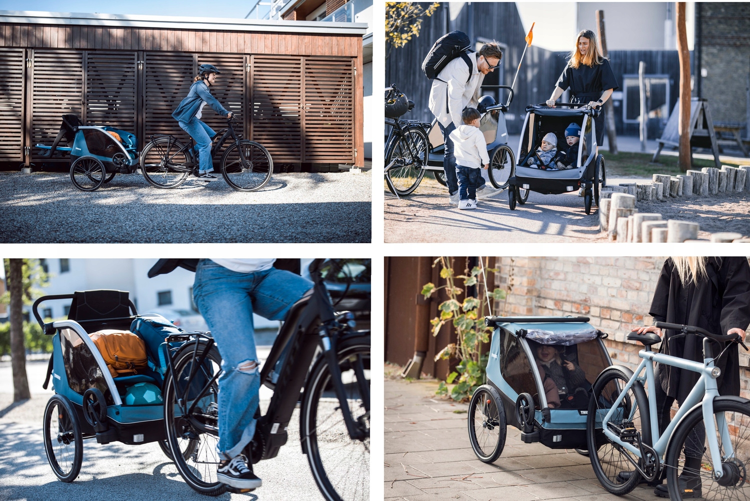 Thule Courier — универсальный велосипедный прицеп для каждой семьи. Этот прочный прицеп идеально подходит для длительных поездок всей семьей или быстрых поездок в город благодаря просторной кабине для двоих детей. Она отлично подходит для поездок на работу и отвоза детей в школу — а по прибытии она легко трансформируется в коляску с компактными колесами для маневрирования в людных местах и полностью регулируемой ручкой для родителей. Этот удобный прицеп также можно полностью превратить в тележку для багажа и многое другое.