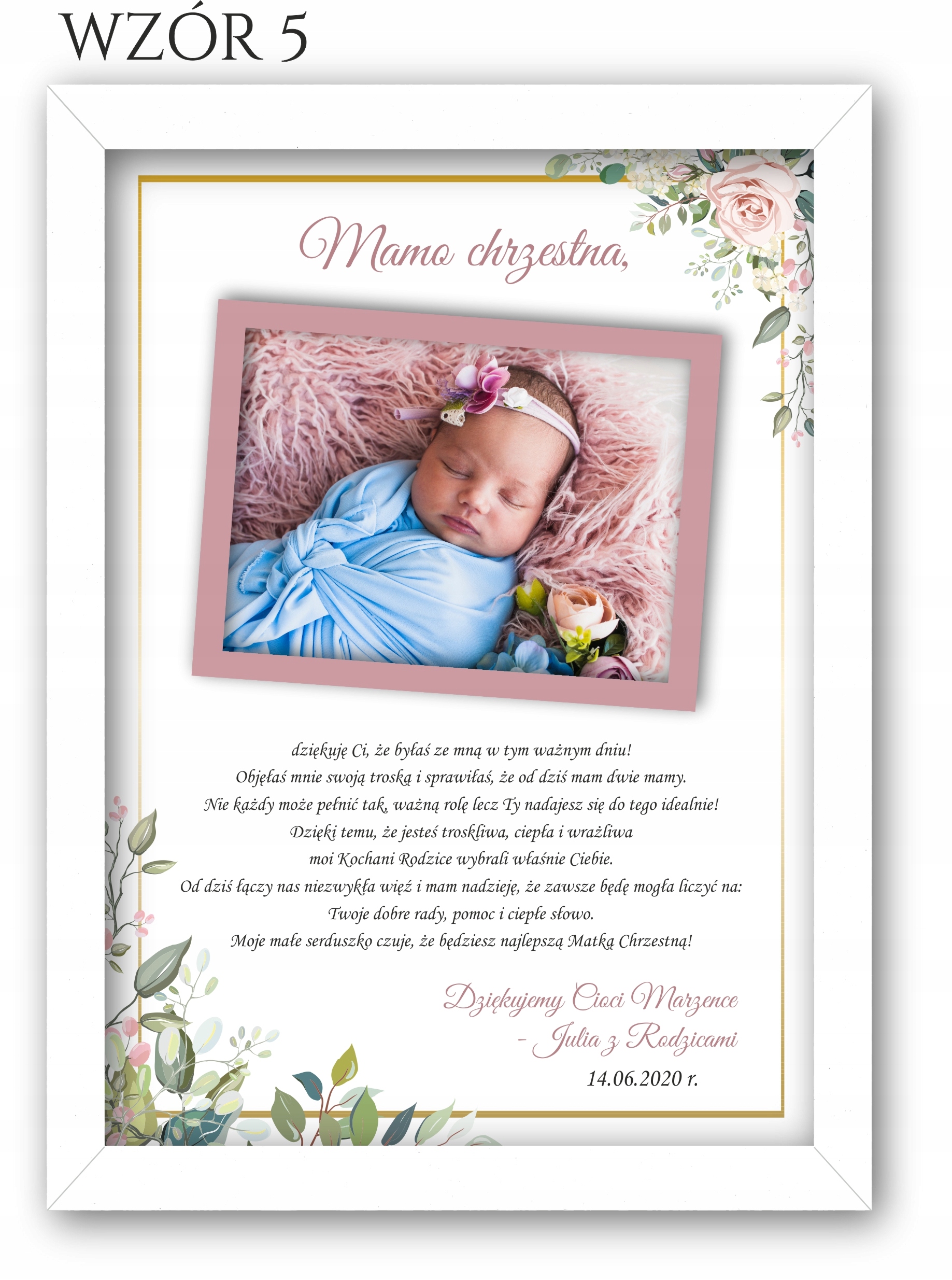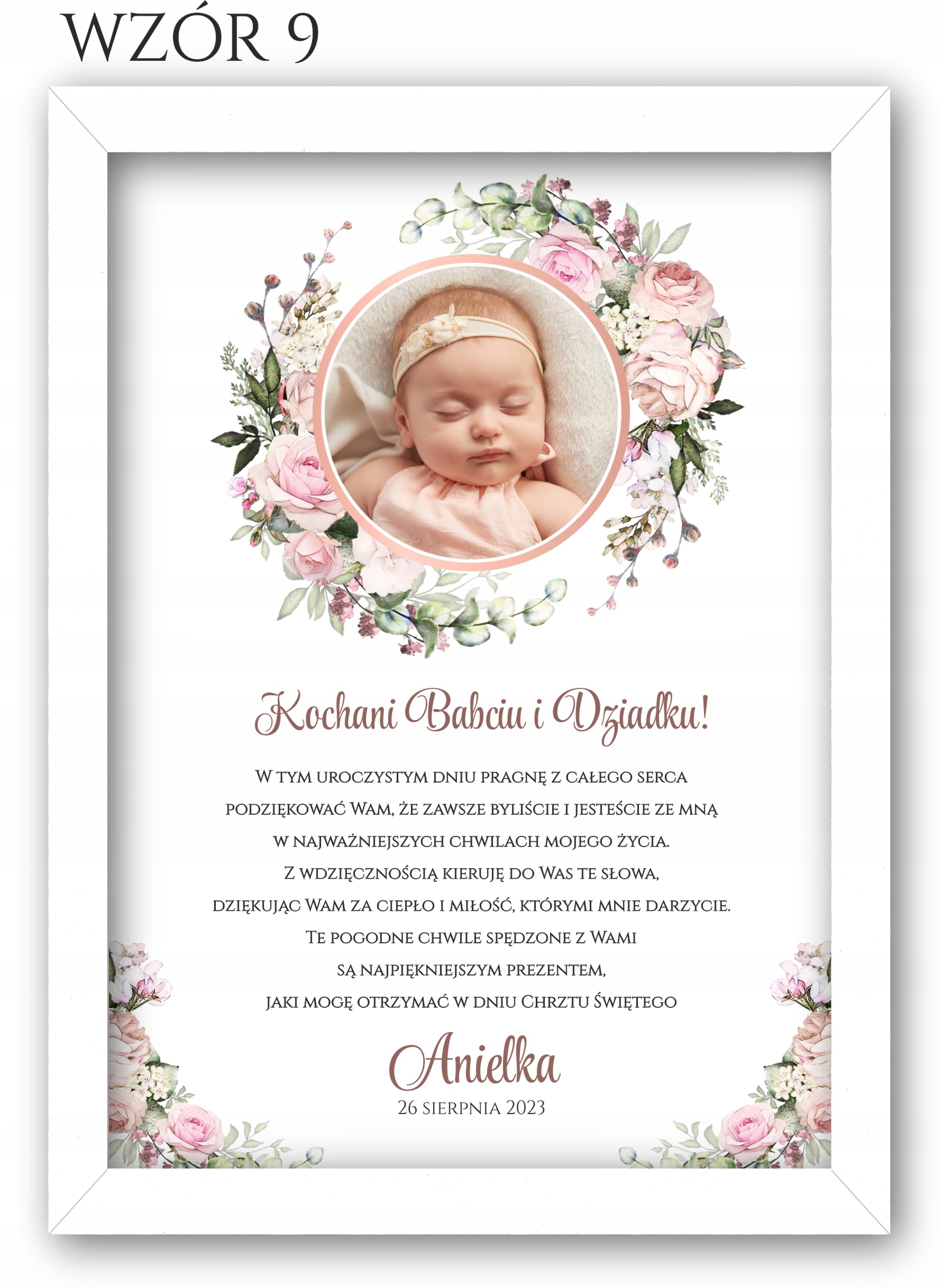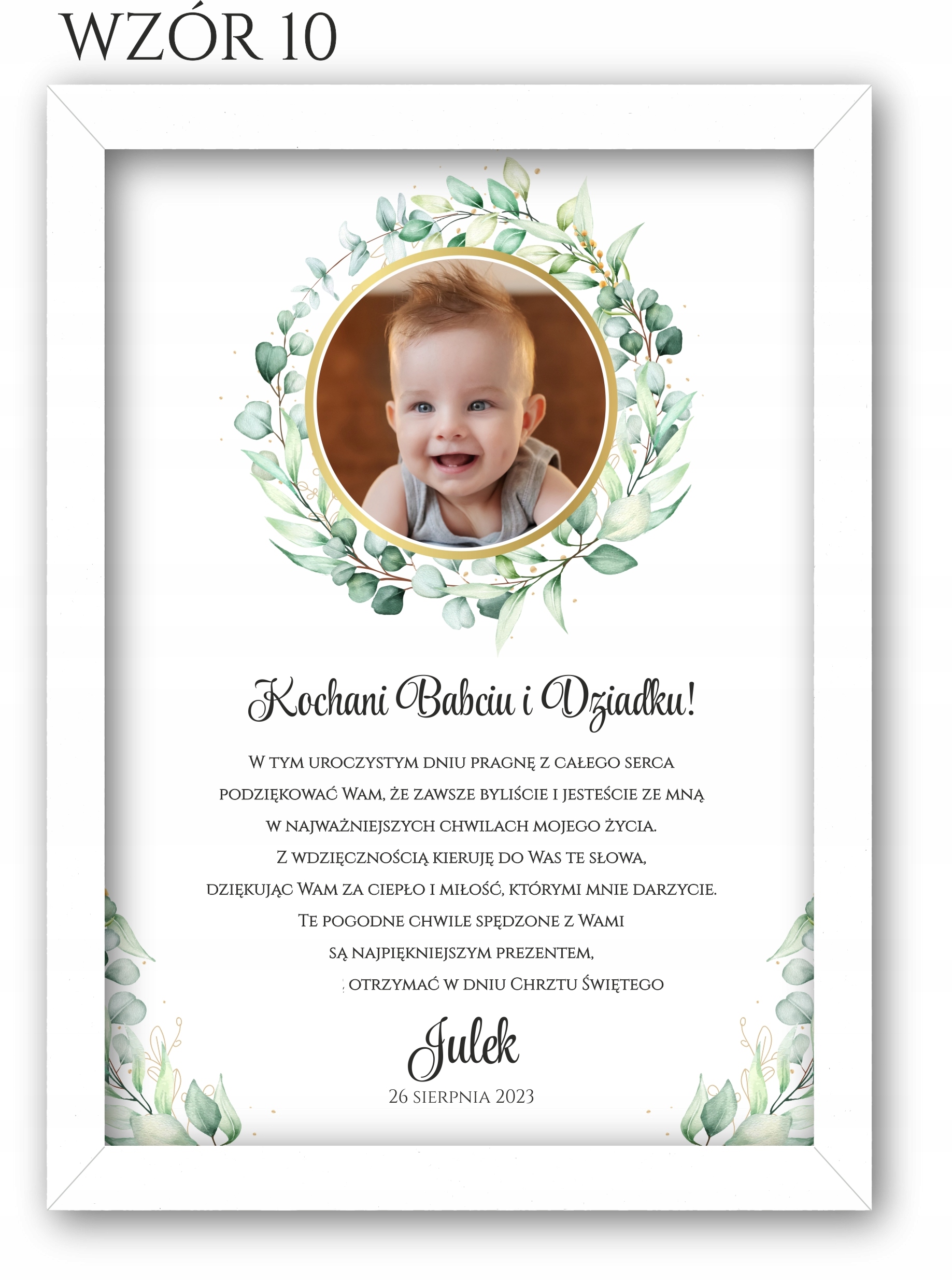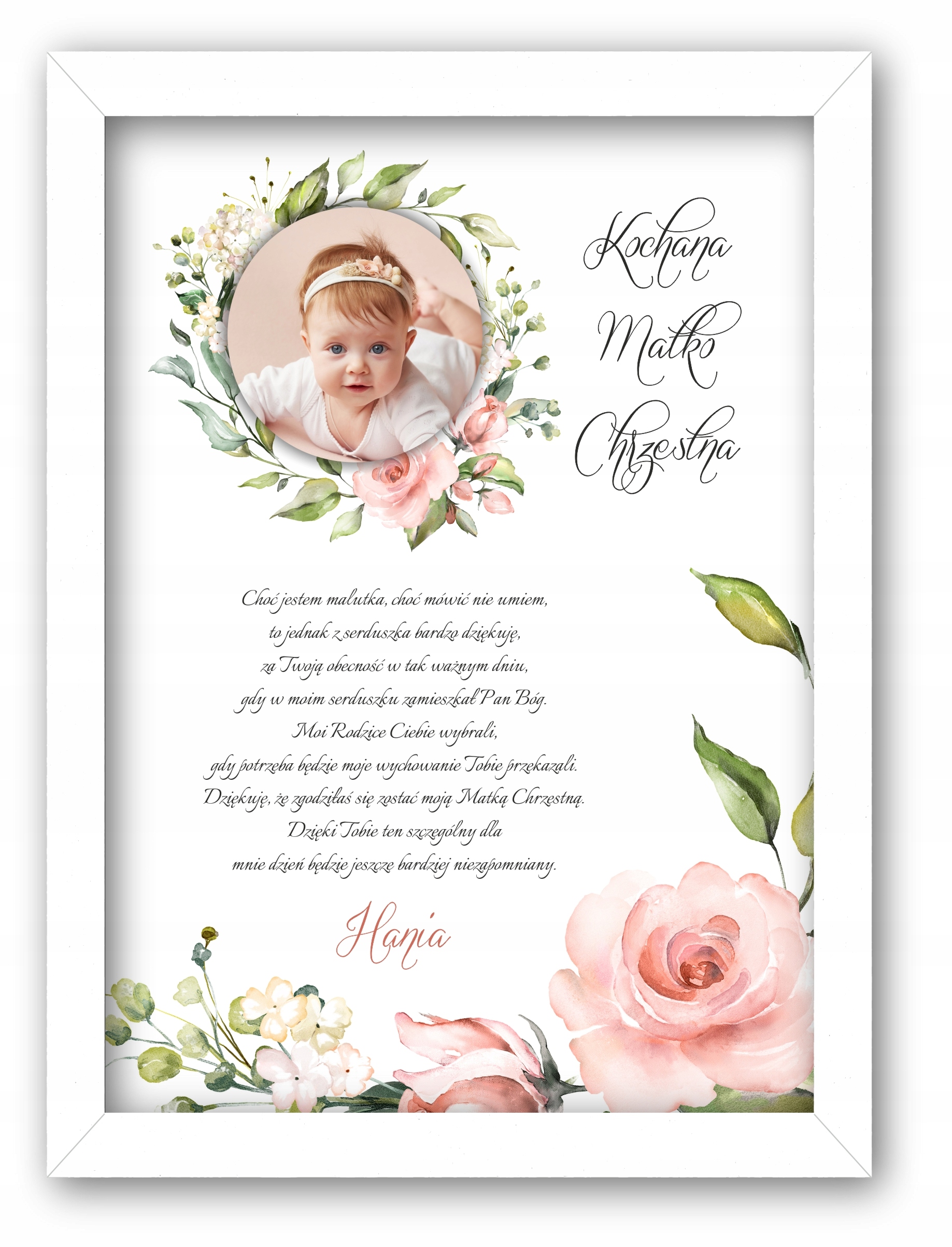 Изящное благодарственное письмо с фотографией для крестных, бабушек и дедушек в белой рамке, чтобы выразить благодарность вашим близким за то, что они пришли на Святое Крещение.