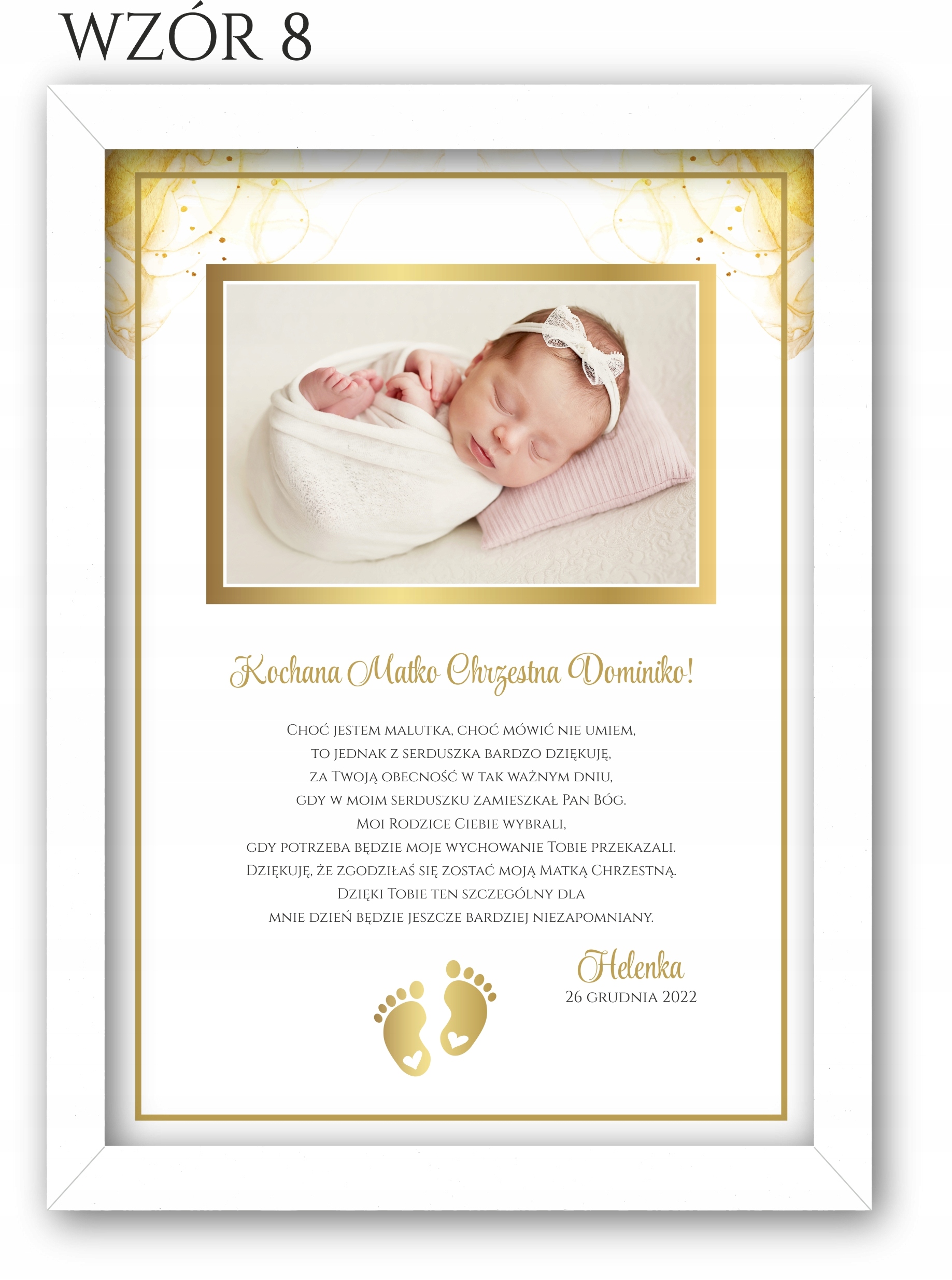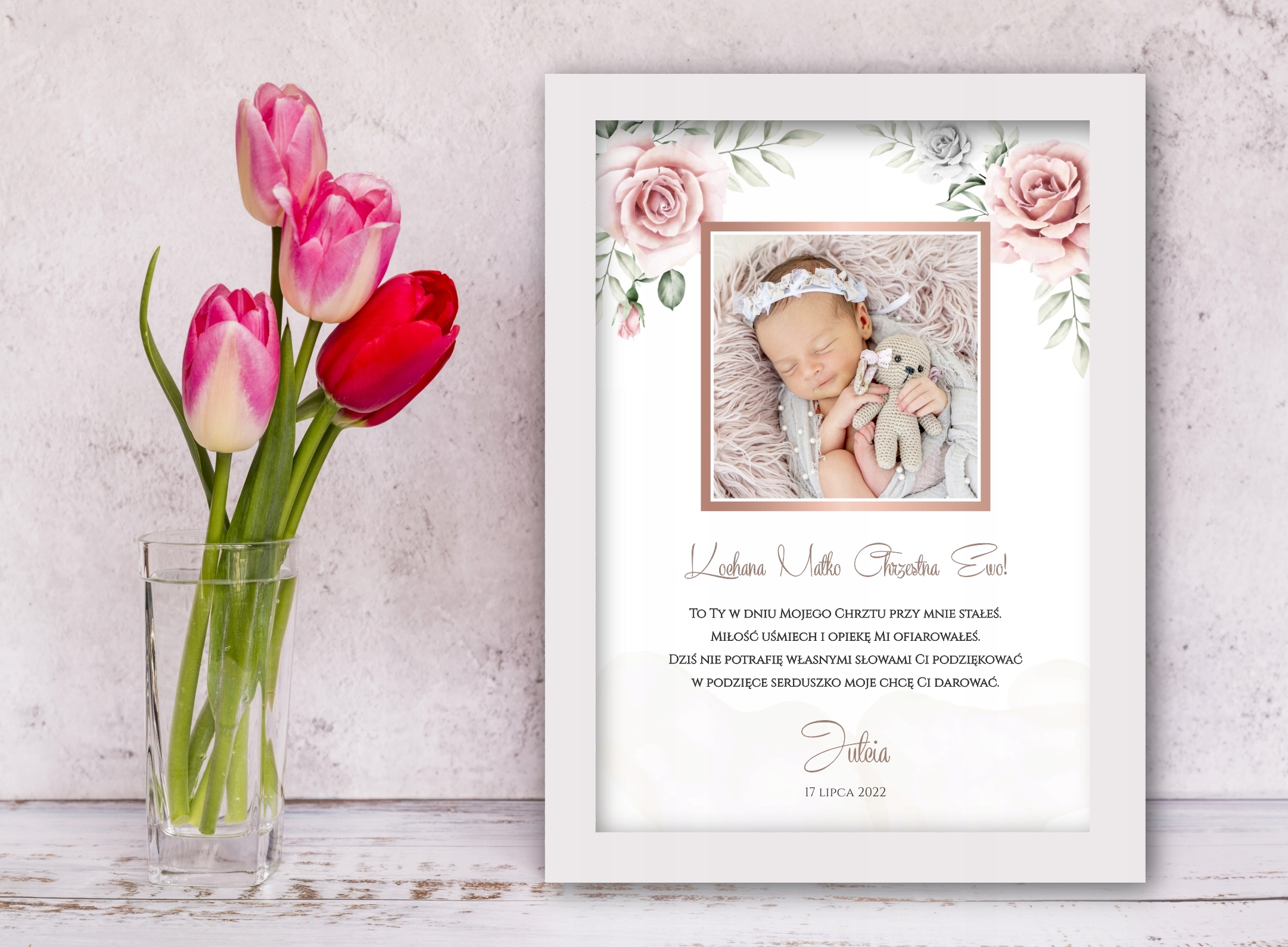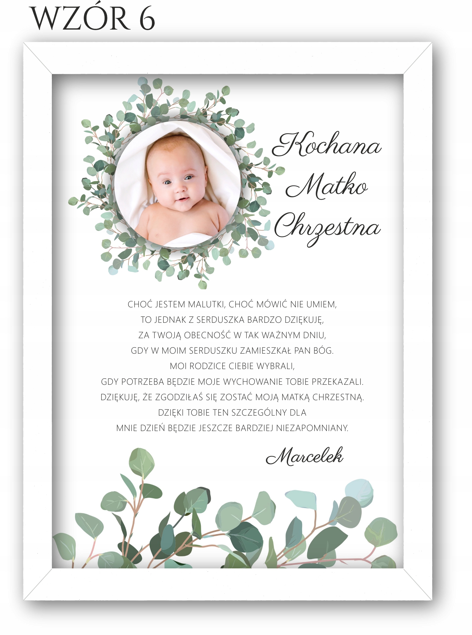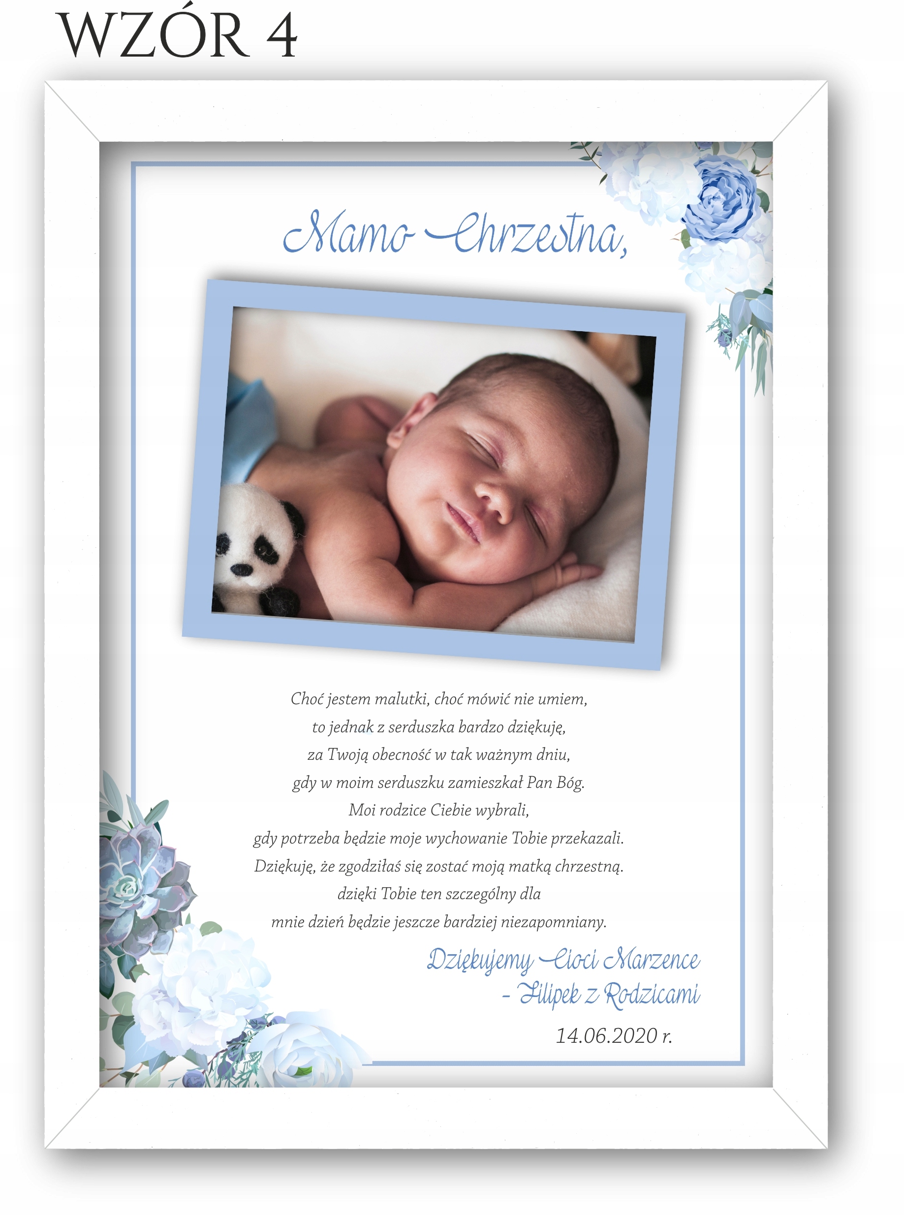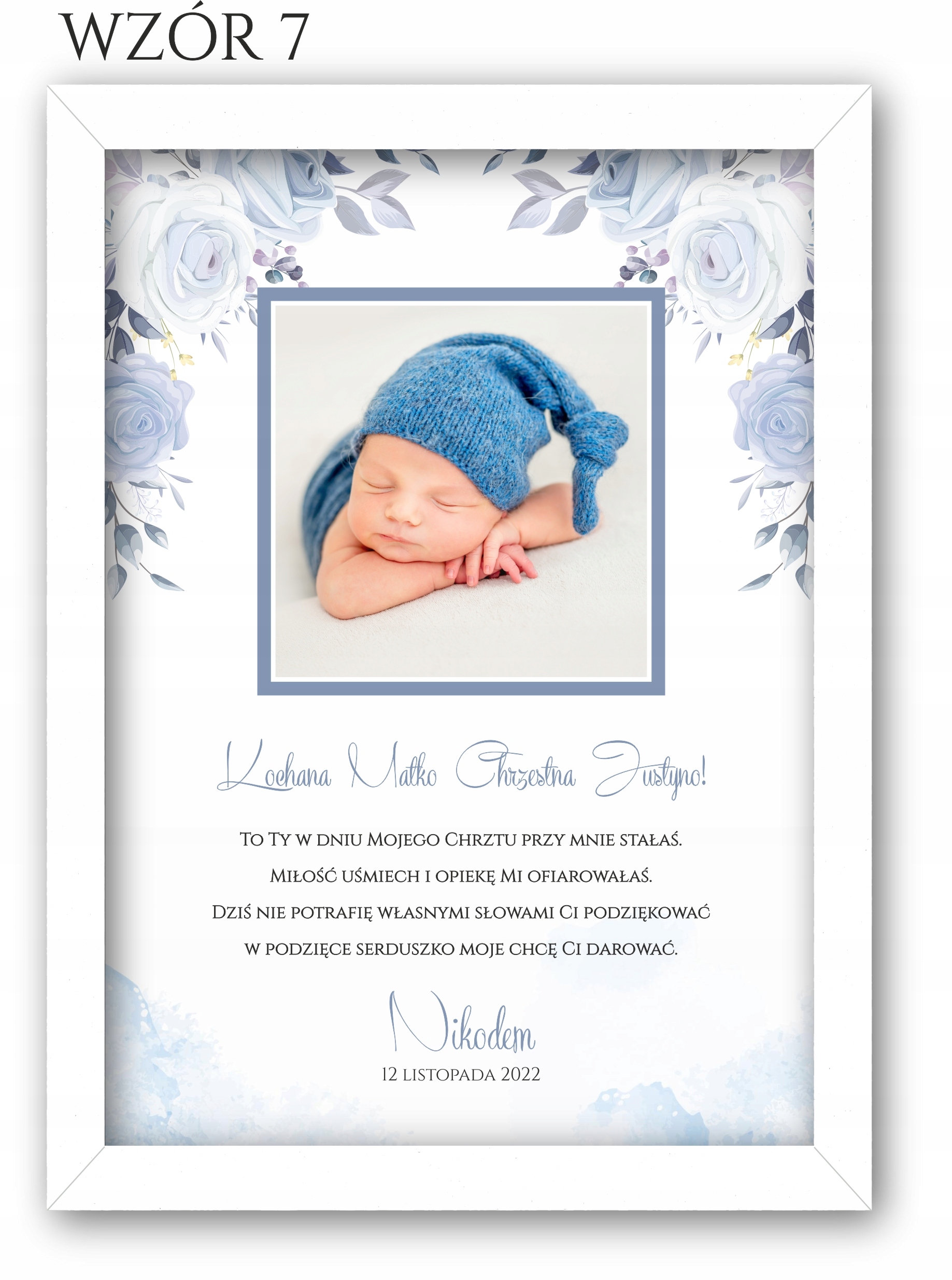 Изящное благодарственное письмо с фотографией для крестных, бабушек и дедушек в белой рамке, чтобы выразить благодарность вашим близким за то, что они пришли на Святое Крещение.