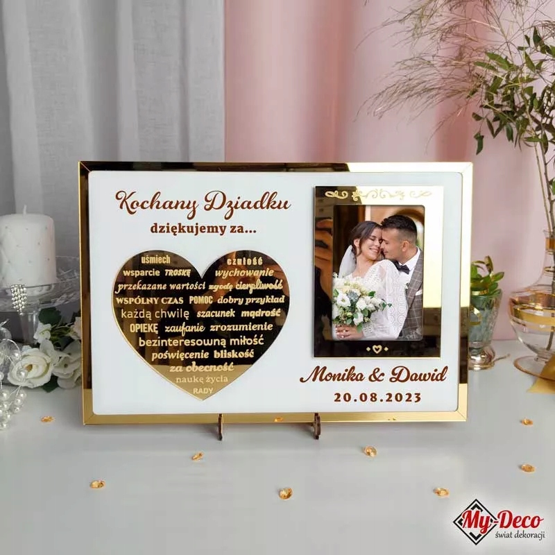 Предлагаемая благодарность крестным, бабушкам и дедушкам Свадебная изготовлена из высококачественного золотого оргстекла, что придает ей элегантность и долговечность. Их уникальный дизайн и изысканные детали делают их идеальным подарком для этого особого случая. Благодарственное письмо родителям выполнено в виде изящной рамки размером 40х27 см, на которой изображено золотое сердечко с написанными на нем благодарственными словами. На доске HDF, на которой основано свадебное благодарственное письмо, мы можем выгравировать имена жениха и невесты, дату свадьбы и посвящение - все это выгравировано с использованием новейшей лазерной технологии. Размер фотографии для рамки 10х15 см.