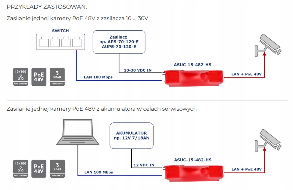 - возможность питания PoE-камеры 48В постоянного тока от любого источника питания напряжением 10...30 В постоянного тока.