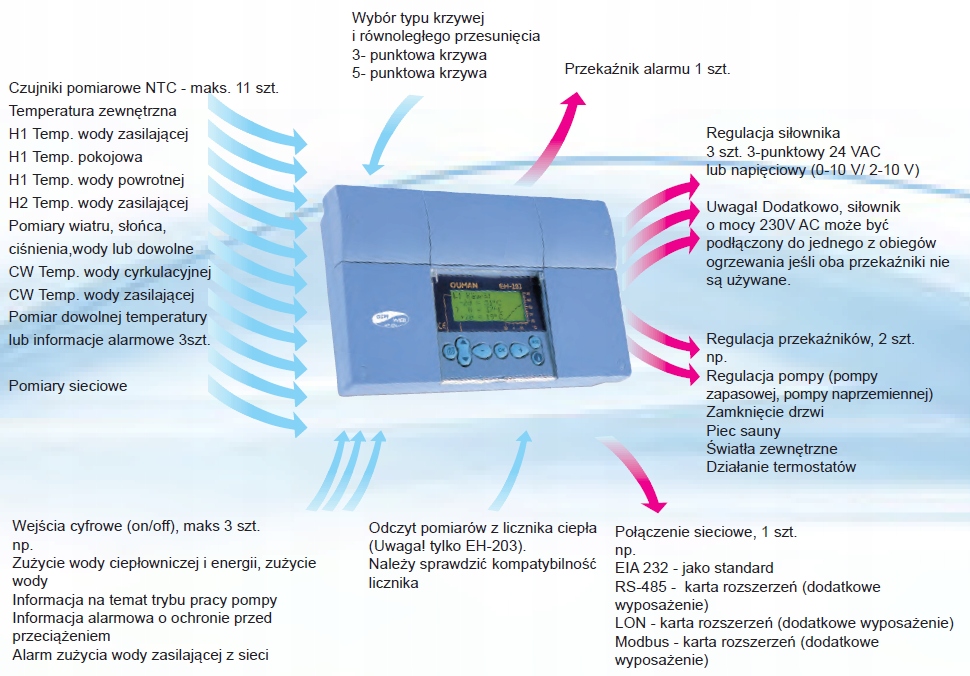 ouman EH-203-это многофункциональный контроллер, который может быть адаптирован к многим различным типам систем нагрева. Ouman EH-203 обладает способностью контролировать две схемы нагревания и одновременно одновременно одну цепь горячей воды. Дисплей контроллера изменяется в зависимости от выбранных и подключенных функций, которые используются. Каждая функция представлена в прикрепленных инструкциях.
