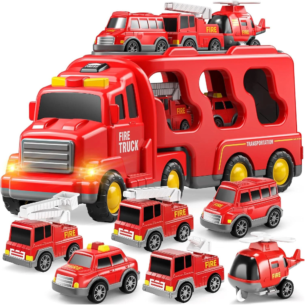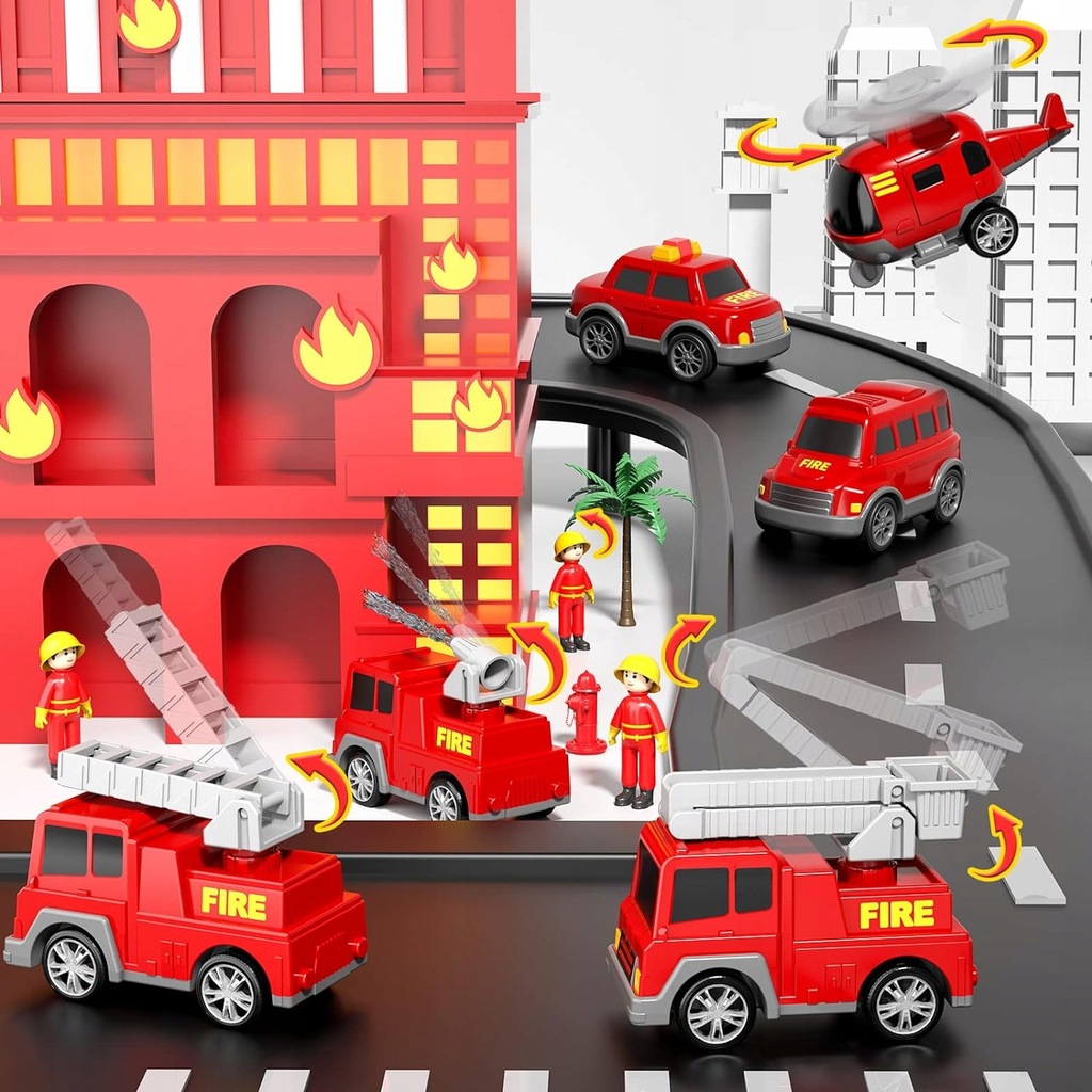 - 🚒 Предназначен для маленьких любителей пожаротушения, включает в себя большую транспортную машину и 6 маленьких автомобилей (пожарная машина, автолестница, вертолет, поливочная машина, легковой автомобиль и внедорожник).