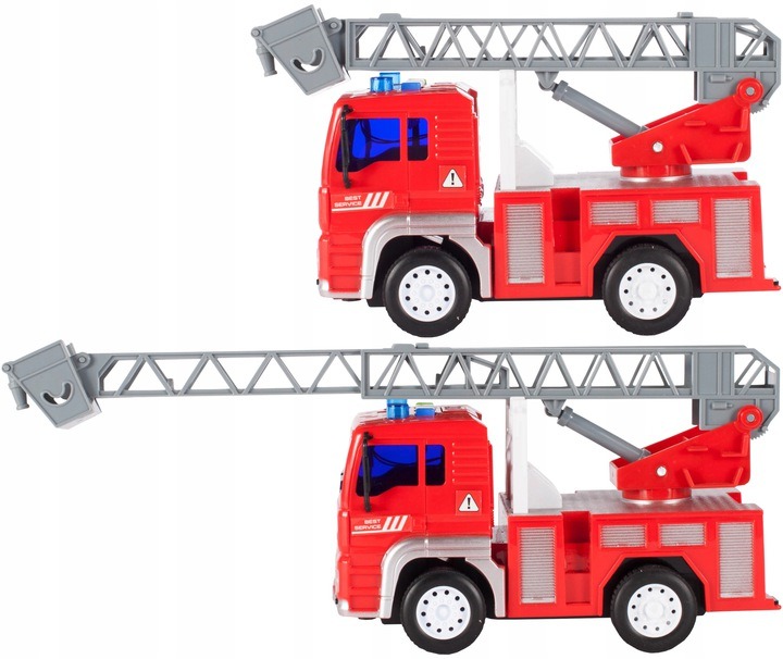 Красная пожарная машина с выдвижной вращающейся лестницей с корзиной и подвижными приводными колесами - просто поставьте машину на пол, подтолкните ее вперед и отпустите машину, которая поедет вперед на своих собственный! В верхней части кабины автомобиля расположены три кнопки.