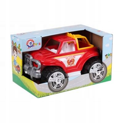 Игрушечный внедорожник (пожарная машина) с открытым кузовом, массивными бамперами-"кенгуру" и большими колесами - уменьшенная копия своего "старшего" близнеца.