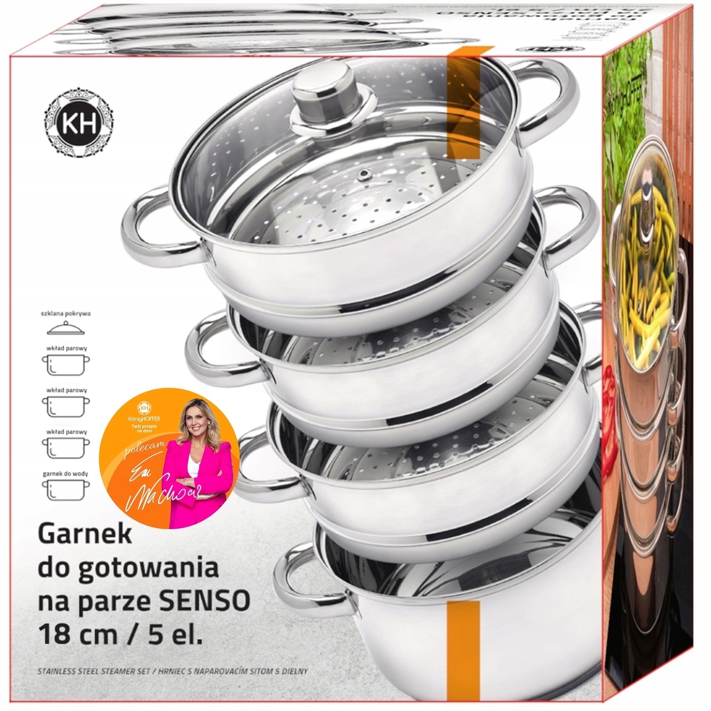 Кастрюля-пароварка Konighoffer Senso 18 см 5 элементов (кастрюля 2,3 л, три вставки для варки и стеклянная крышка с вентиляционным отверстием и стальной отделкой) позволяет приготовить вкусные и сбалансированные блюда на одной конфорке. Продукты, приготовленные на пару, не теряют питательной ценности и сохраняют цвет и консистенцию. Благодаря этому вы заботитесь о своем здоровье. Изготовлен из нержавеющей стали, экономит время и энергию (сырье быстро нагревается и сохраняет температуру). Он не влияет на свойства изделий и долговечен. Эта посуда подходит для любого типа плиты (электрической, газовой, индукционной и керамической). Продукт рекомендует Ева Вахович. Как амбассадор бренда Konighoffer, она горячо и с улыбкой рекомендует его для домашнего использования. Вместе с ним вы получите свой рецепт для дома. Это один из лучших вариантов в этой категории!