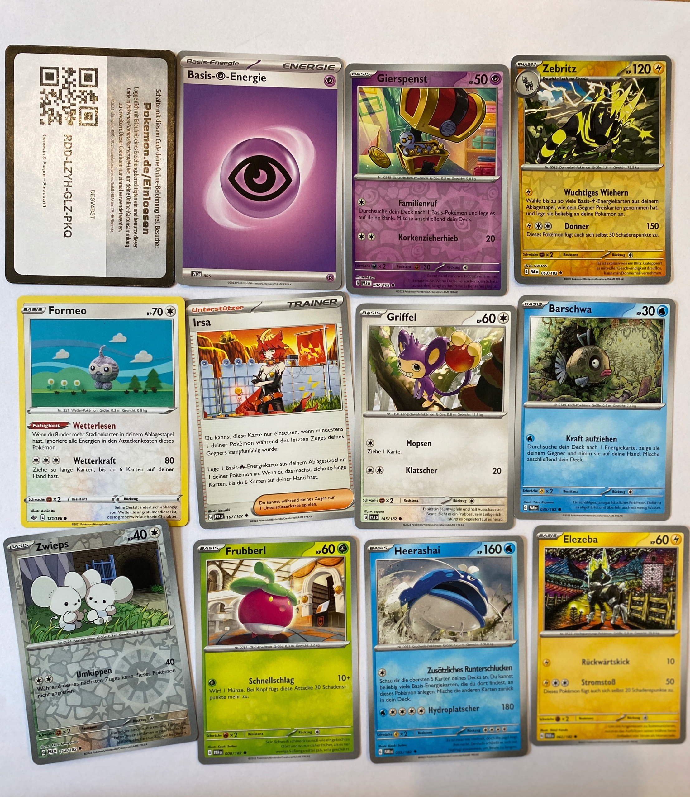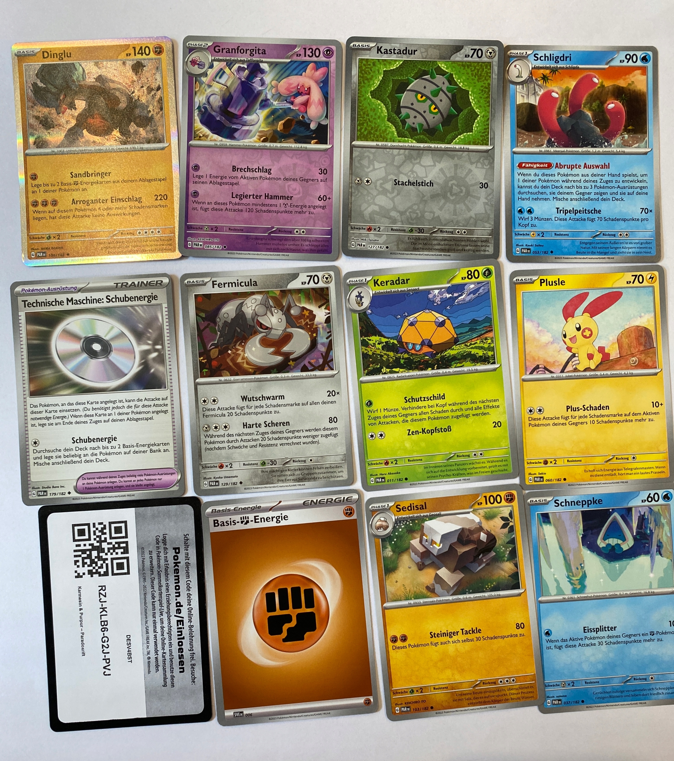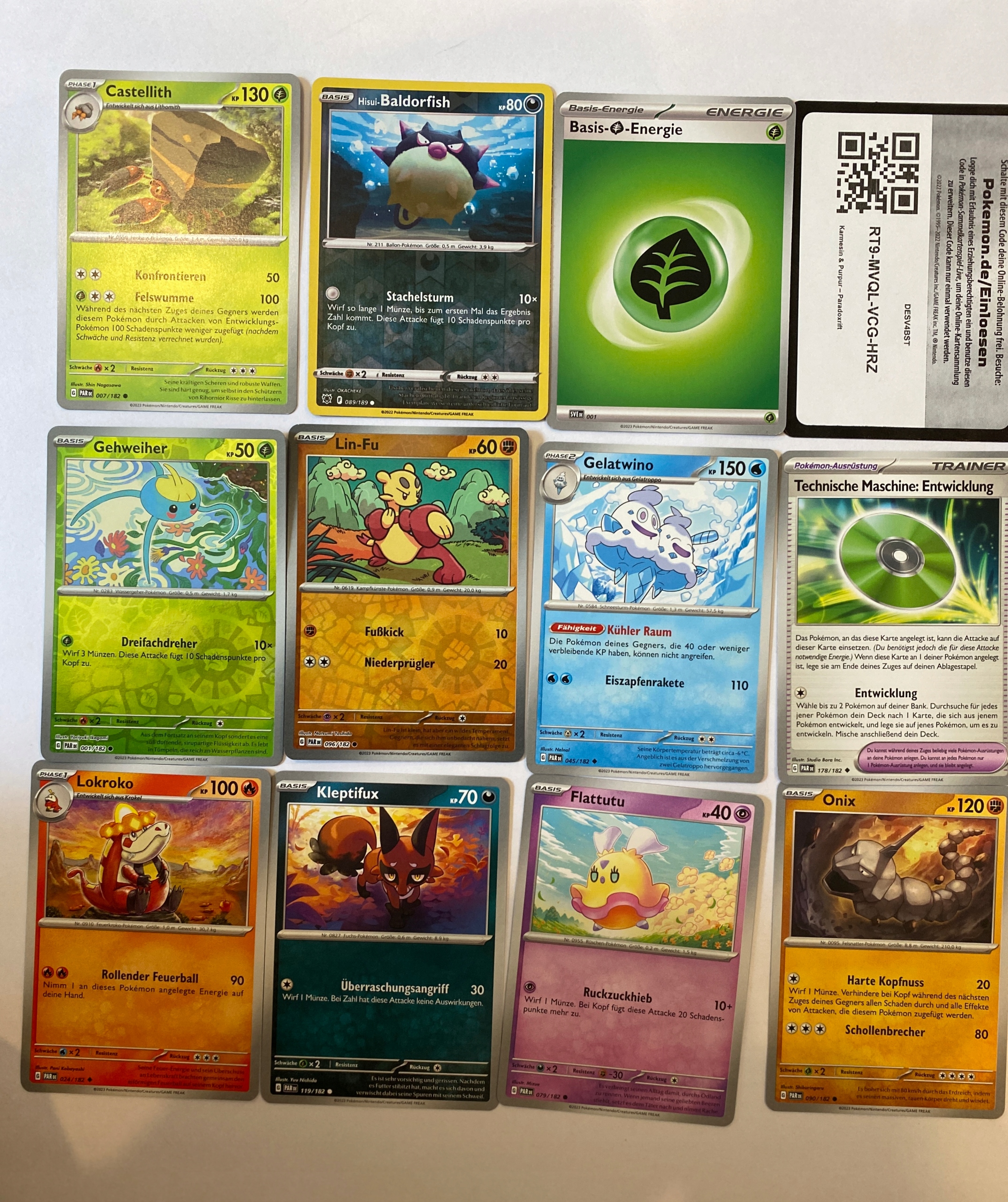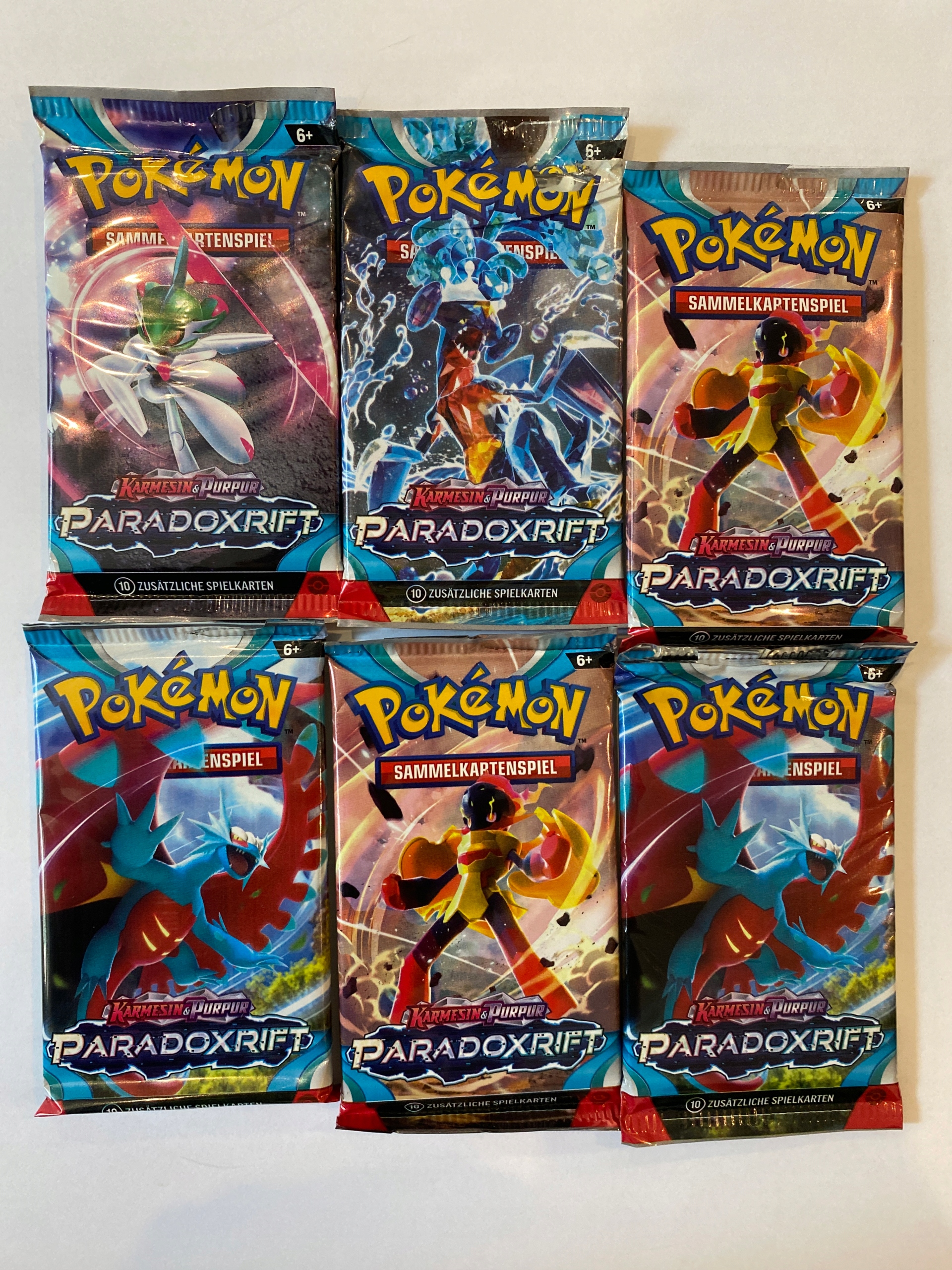 содержит 6 пакетов-бустеров с расширением Pokémon Karmesin & Purpur-Paradoxrift (каждый пакет Booster содержит 10 карт и 1 основную энергию, с 3 гарантированными голографическими картами в каждом пакете укрепления).