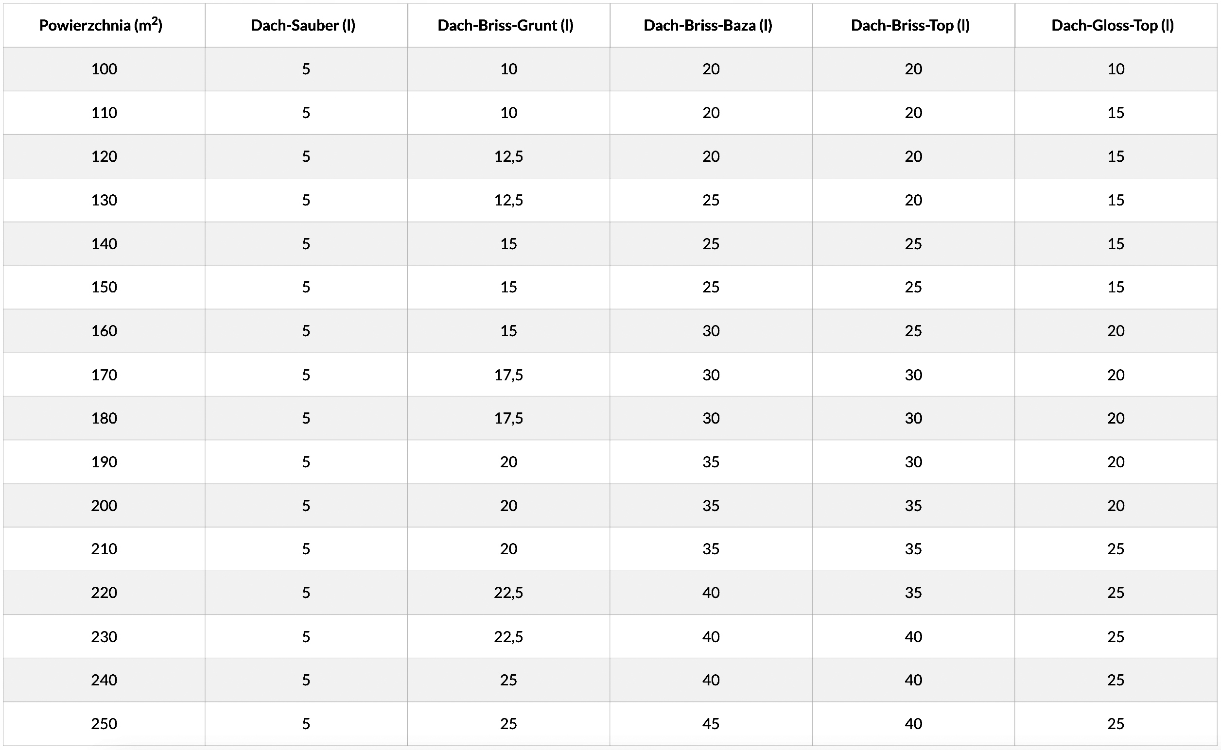 В таблице ниже вы найдете соответствующее количество продуктов, необходимое для покрытия определенных поверхностей крыши.