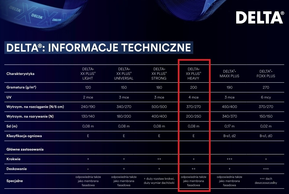 Мембрана DELTA-XX PLUS® HEAVY представляет собой надежное решение для крыш с опалубкой и без нее и соответствует карточкам продуктов ZVDH UDB-A и USB-A. Его также можно использовать в качестве временного покрытия и подложки под металлическую кровлю, фиброцементные плиты или шифер, а также в качестве фасадной мембраны за вентилируемыми облицовками с закрытыми стыками.