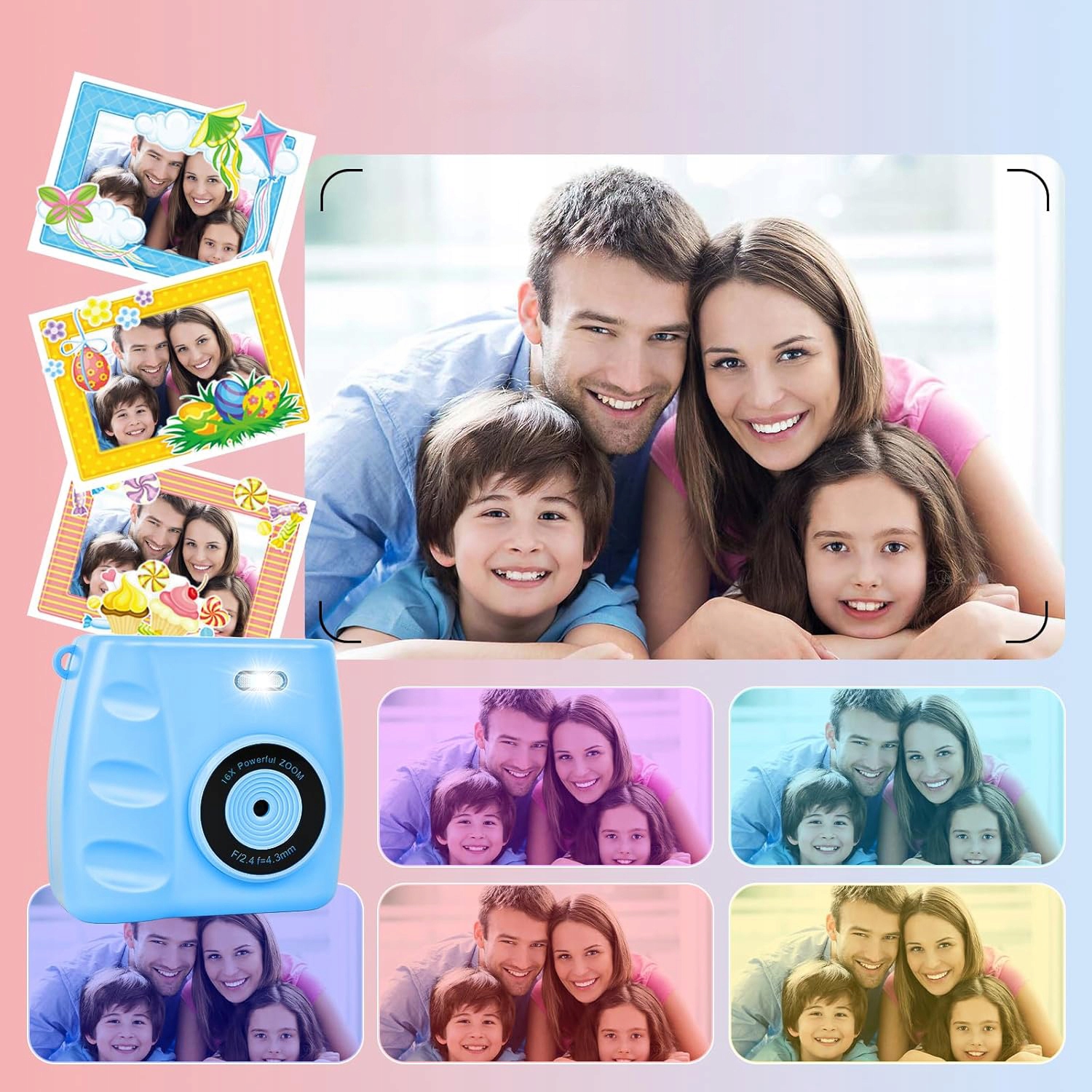 - Благодаря большому 2,4-дюймовому экрану удобно просматривать и редактировать фотографии, имеется множество интересных фотофильтров, рамок и спецэффектов.