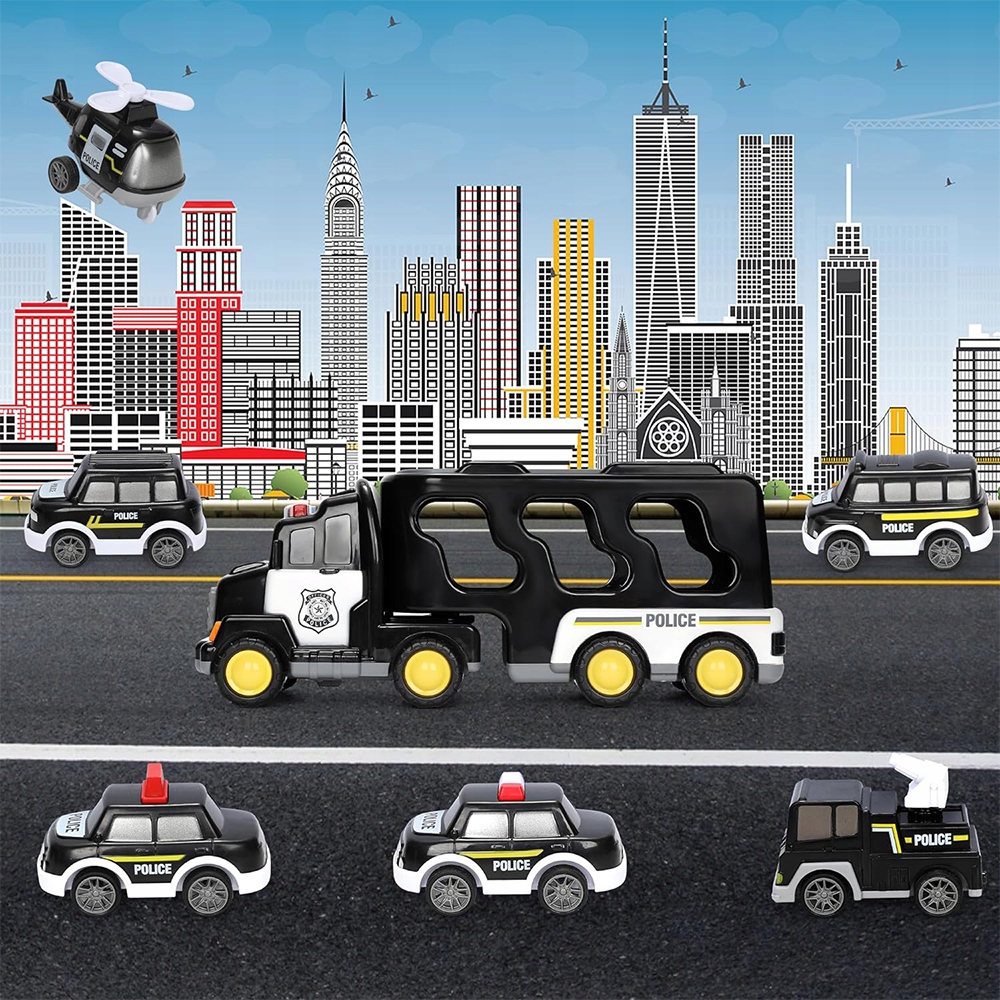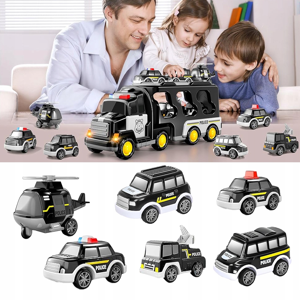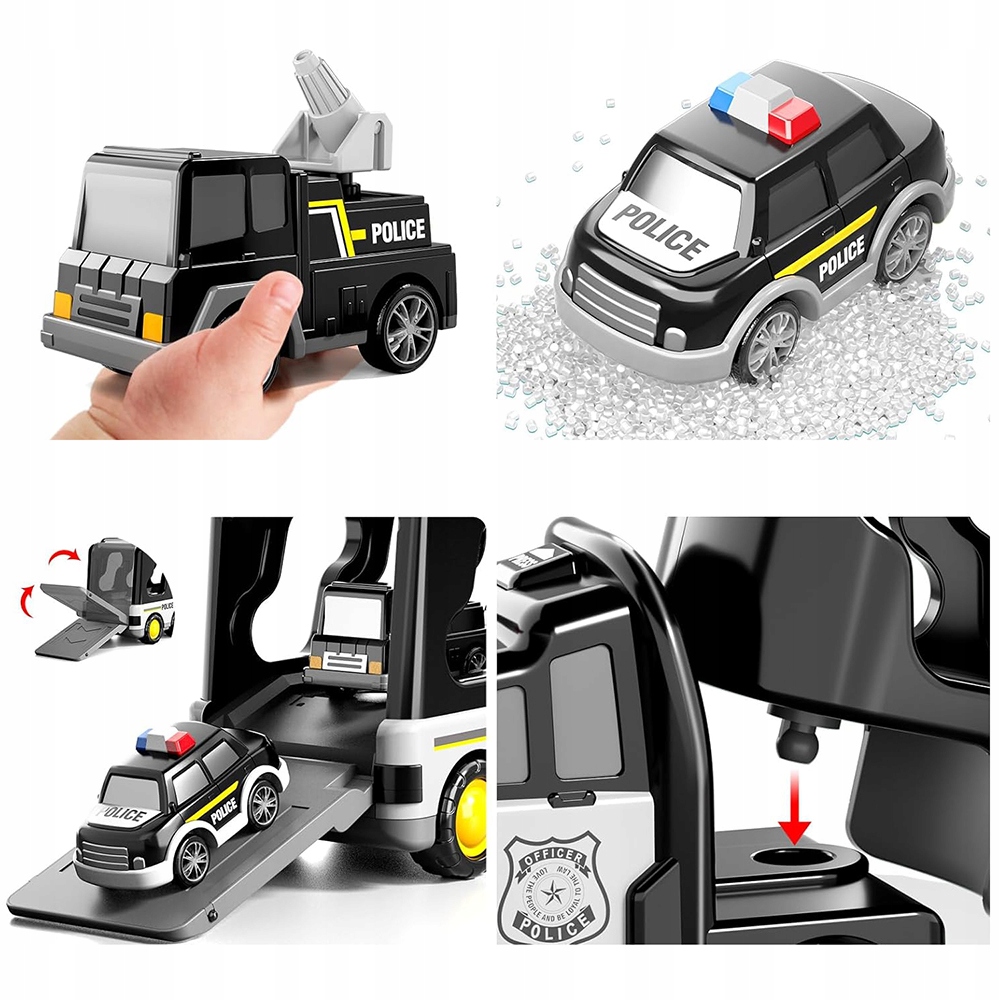 🚔🚔- Разработано для небольших любителей полиции, содержит больший транспортный грузовик, 5 небольших автомобилей и 1 маленький вертолет. Это занимает всего около 8 секунд каждый раз, когда нажата кнопка. Возьмите машину на определенное расстояние, затем отпусти свою руку, чтобы идти вперед. Кабина большого транспортного грузовика может быть отделена от грузового отсека, а задница может быть открыта для разгрузки и загрузки небольших автомобилей