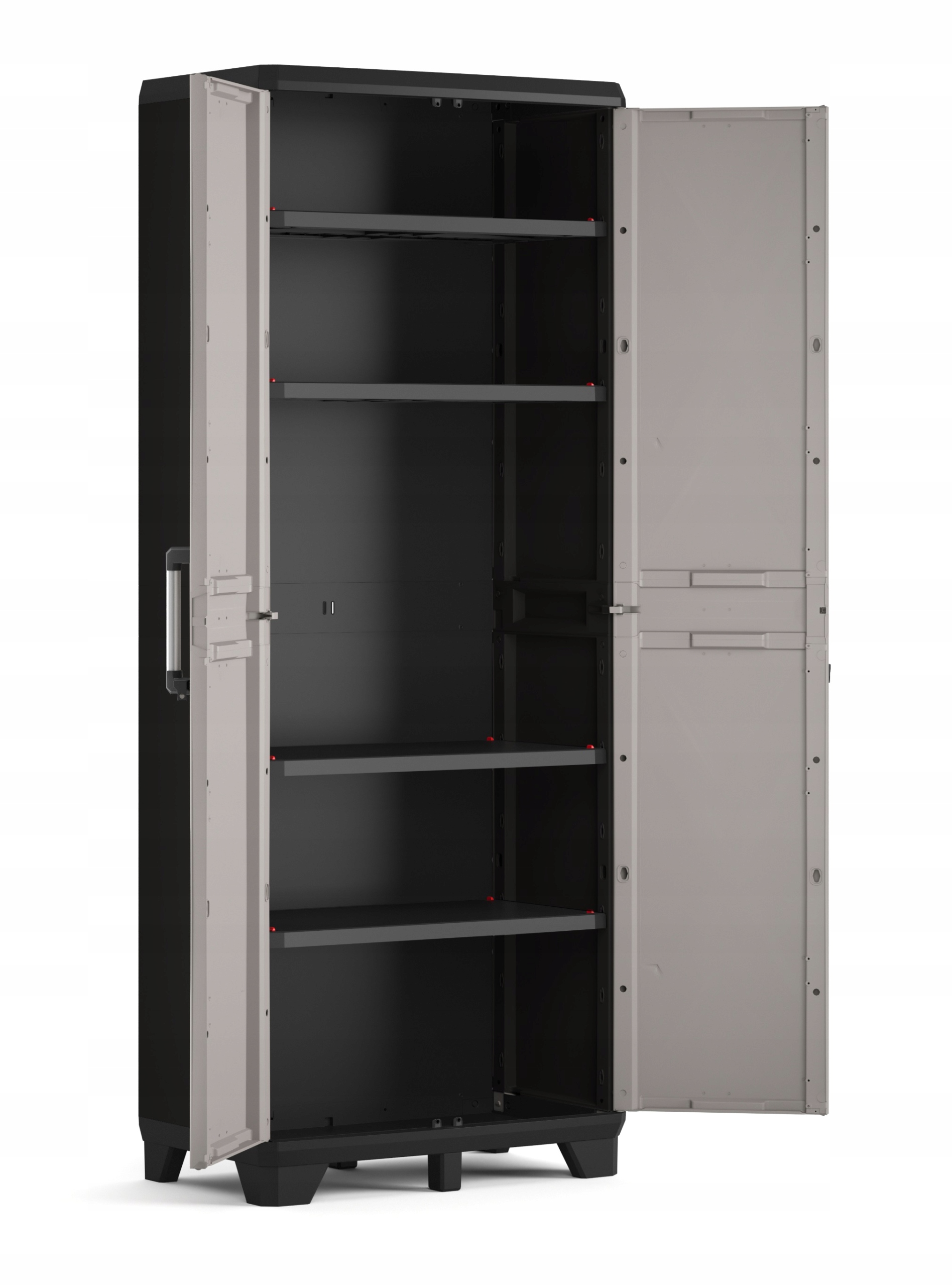 Шкаф оснащен эргономичными ручками, которые обеспечивают легкий доступ к его внутреннему пространству. Для повышения безопасности в двери имеются отверстия, позволяющие эффективно установить навесной замок. Благодаря этому мы можем спрятать в него чистящие средства, не беспокоясь о своих детях. Гардероб также останется в безопасности на террасе или низком балконе. Навесной замок приобретается отдельно.