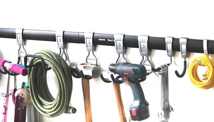 Наденьте черную крышку KENOVO на стальную полосу, прикрученную к стене, а к крышке прикрепите/прикрепите крючки, корзины, вертикальные планки и т.п.