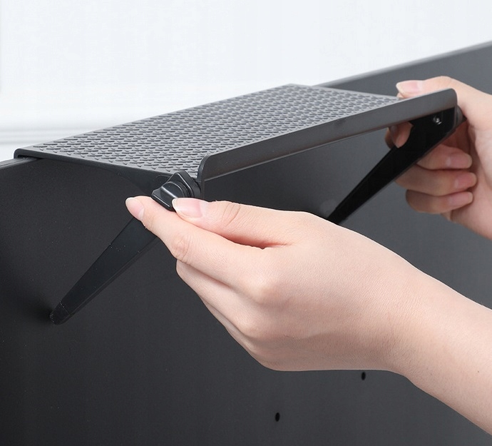 Удобная, компактная полка, предназначенная для крепления на верхнюю часть рамки телевизора или ЖК-монитора. Это позволяет разумно сэкономить место на столе и столе. Очень простая и неинвазивная установка предотвращает повреждение оборудования. Регулируемая ручка позволяет менять угол наклона полки и подогнать ее к задней части экрана. Отличный гаджет, позволяющий удобно хранить пульт от телевизора или другие мелкие предметы.