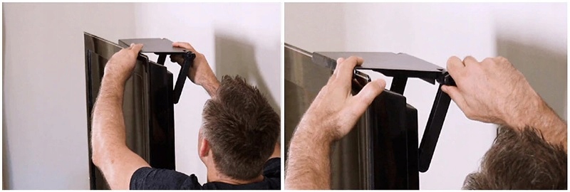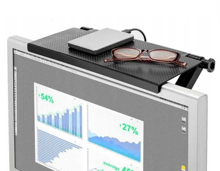 Полка имеет регулируемые опоры, поэтому инструменты не требуются. для установки его установки. Просто поместите его верхнюю часть на верхнюю часть экрана и, отрегулировав угол наклона опор, зафиксируйте их, затянув ручку.