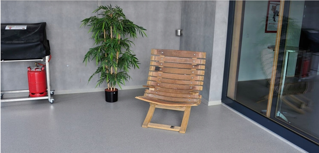 Подготовка основы, оклейка самоклеящаяся армирующая бутиловая лента для стыков балкона/стены и отлива/отлива балкона, цель которой – укрепить стык. Если на основании есть неровности, перед покраской слоем грунтовки можно зашпаклевать смолой для заполнения зазоров с добавкой кварца под названием Репарир С. После затвердевания смолы в зазорах приступаем к нанесению первого слоя грунтовки. прямо на бетон. Для этого делаем базовый слой из цветной эпоксидной смолы Micronfloor pox Aqua G20, берем ее и смешиваем ингредиенты pox aqua g20-A и pox aqua g20-B, затем добавляем от 5% до 10% воды и еще раз перемешиваем. Наносим от 0,4 до 0,6 кг смолы на м² в зависимости от впитывающей способности бетона. Цель этого слоя - получить однородный цвет, который можно посыпать смесью цветных хлопьев.