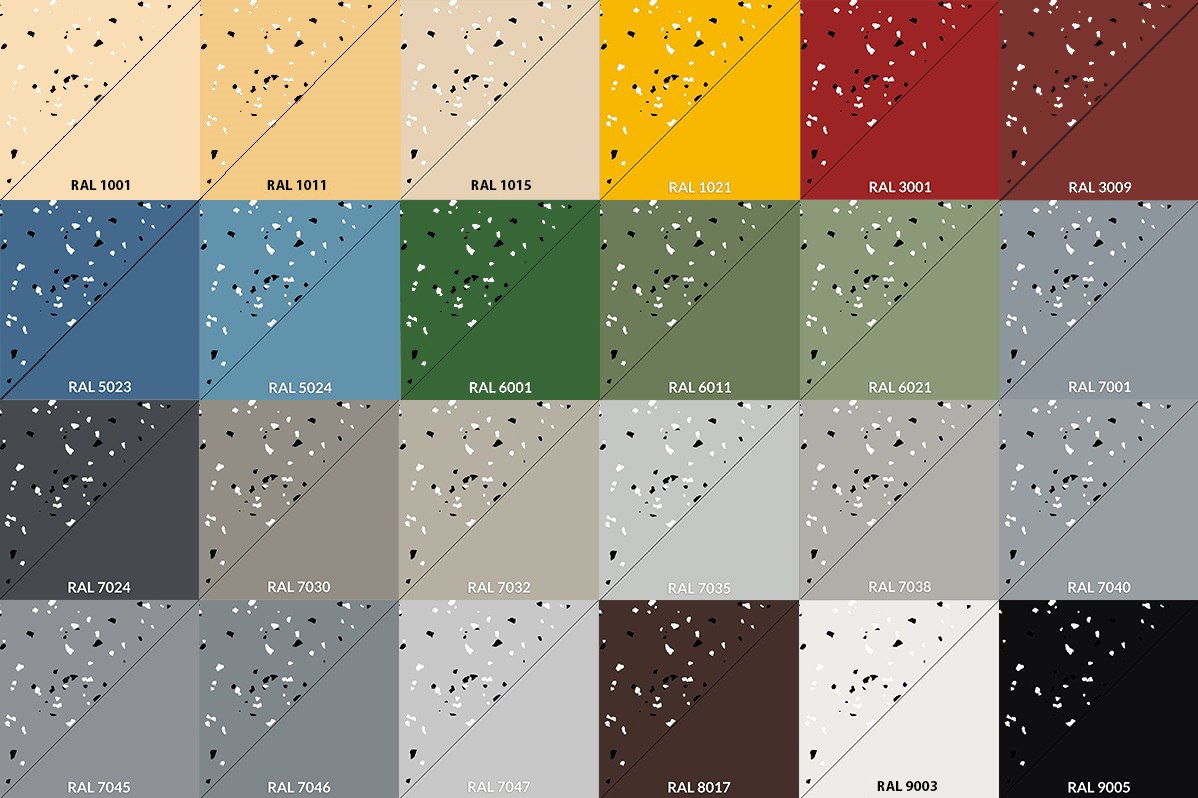 Доступные цвета: RAL: 1001, 1011, 3009, 6021, 7001, 7030, 7032, 7040, 7045, 7046, 7047, 1021,1015, 6001, 6011, 7035, 8017, 9003, 9005, 5024, 3001, 5023, 7024, 7038
