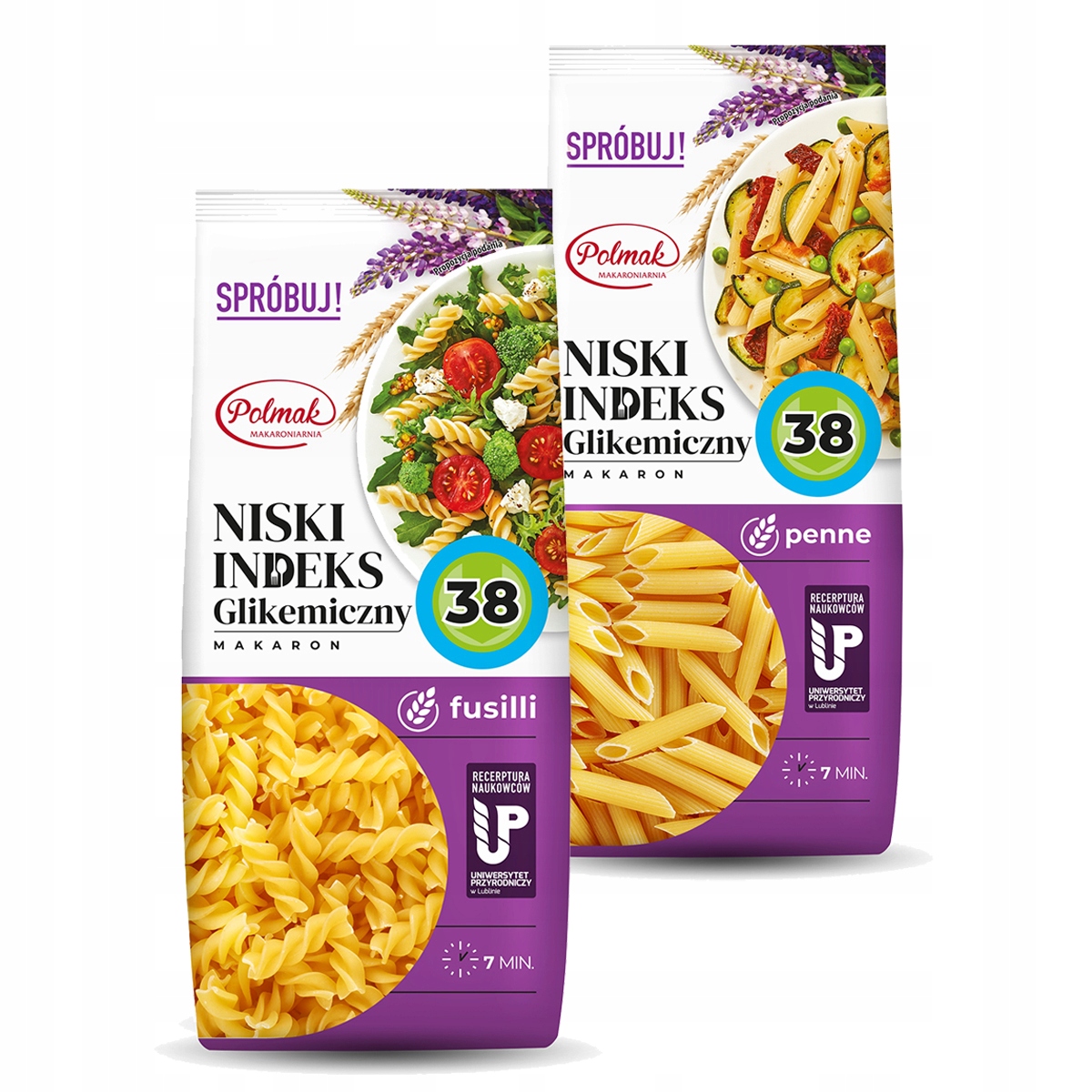 Макароны Polmak Świderki с низким гликемическим индексом Макароны Polmak Świderki — единственные легкие макароны на рынке с удельным гликемическим индексом 38, которые, благодаря высокое содержание углеводов и белков насыщает надолго и поддерживает стабильный уровень сахара в крови, поэтому подходит для диабетиков и людей, которые заботятся о здоровой массе тела. Люпиновая мука: - снижает ГИ Мука твердых сортов: - отвечает за светлый цвет - придает традиционный вкус - сохраняет идеальную форму после приготовления Пищевые волокна: - поддерживают перстальтику кишечника - помогают контролировать уровень инсулина в крови.