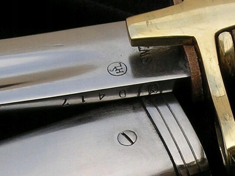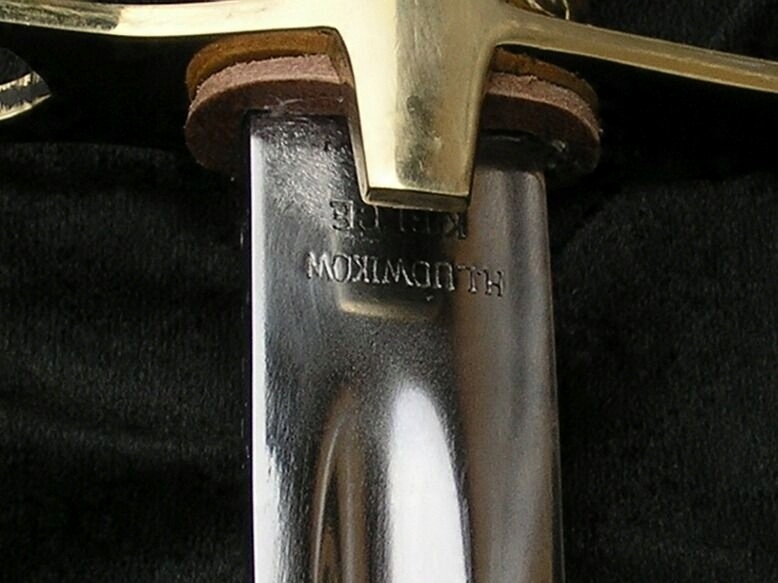 " Рукоять закрытая, латунная оправа. Крестовина арбалета с усами. Передняя часть гарды изготовлена из наклонно изогнутой древесины бука. Задняя часть заканчивается отверстием для ремня, прикрытым закругленной рукояткой. хвостовик с двумя стальными винтами с латунными гайками и латунным кольцом в основании, с вырезами для усов. Клинок полированный, с небольшой кривизной, шлифованный с обеих сторон, с одинарной бороздкой и желобком по обуху (т. - так называемый полукруглый разрез Монморанси). Клинок обоюдоострый, гравировка центрическая. На внутренней стороне у основания выбита подпись производителя H.LUDWIKÓW/KIELCE, а на внешней стороне - S.WZ.34. и пунка с государственным гербом - орлом и клеймом ВХЛ. На тыльной стороне клинка выштампованы К2 получателя и номер оружия от Д 401 до Д 430. Стальные ножны с одним пазом и подвижным колесиком. Асимметричная прямоугольная шпора. Номер оружия находится на внешней стороне шпоры, а точка приема К2 - на внутренней стороне. "1.