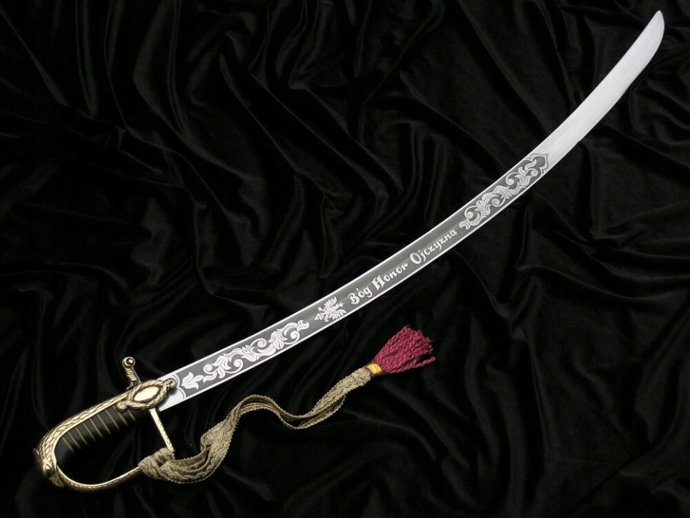 Сабля не затачивается и не предназначена для заточки (не пригодна для фехтования). Клинок (клинок) изготовлен из полированной углеродистой стали. Полировка производится до получения однородной, матовой, гладкой структуры. Мы рекомендуем время от времени консервировать лезвие очень тонким слоем оливкового масла или другого смазочного средства, предназначенного для консервации стали (это поможет сохранить высокое качество продукта). Ножны хромированы и не требуют ухода.