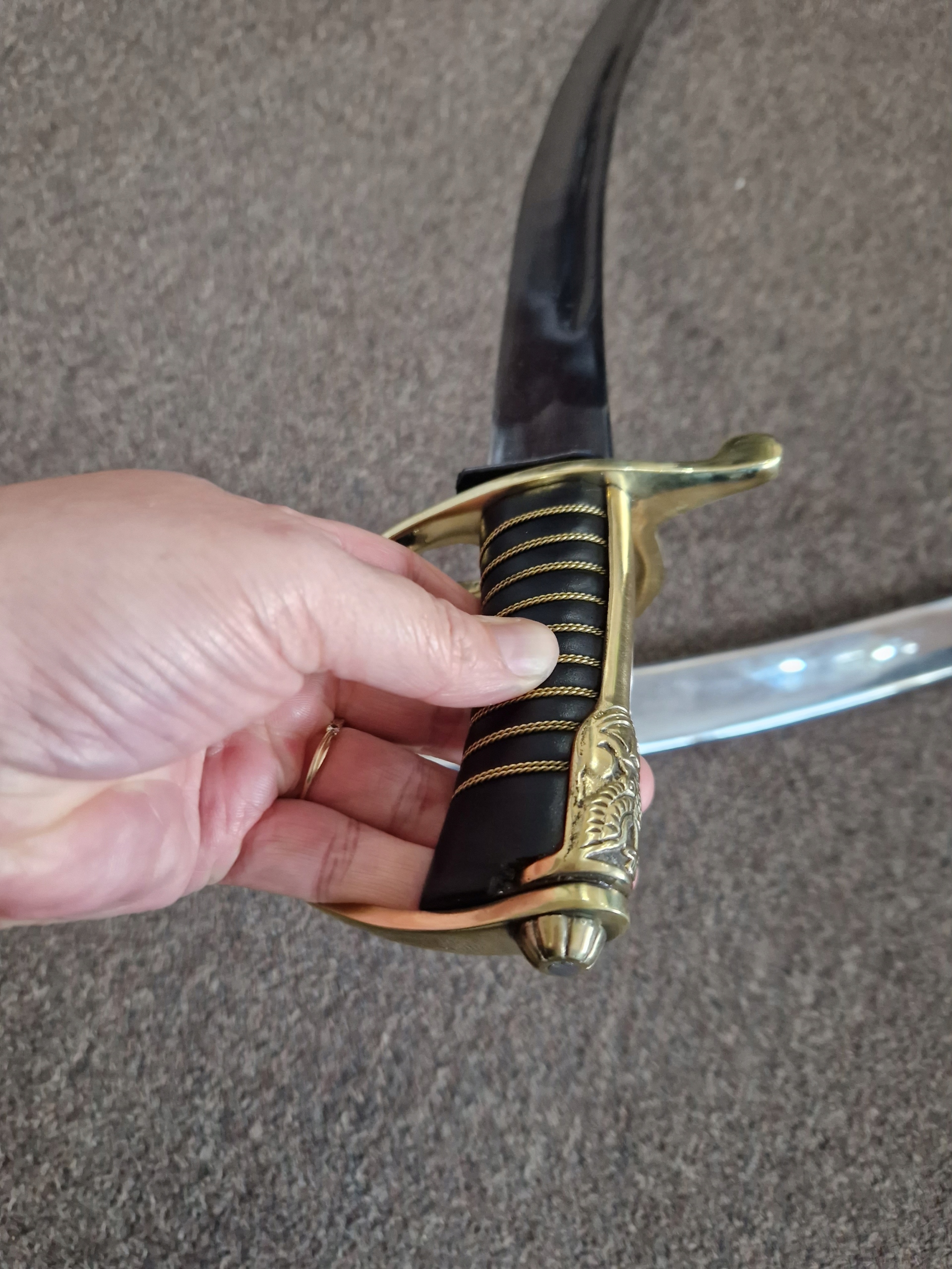 Ручка полностью закрытая, с золотистым наличником и декоративными кисточками. Перекладина с тремя дужками изогнута в виде полустремя - боковые дужки, согнутые S-образной формы, сходятся в середине передней гарды. Задний рычаг поперечины имеет каплевидную форму. Рукоять обтянута черной кожей, золотой нитью и декоративным капюшоном.
